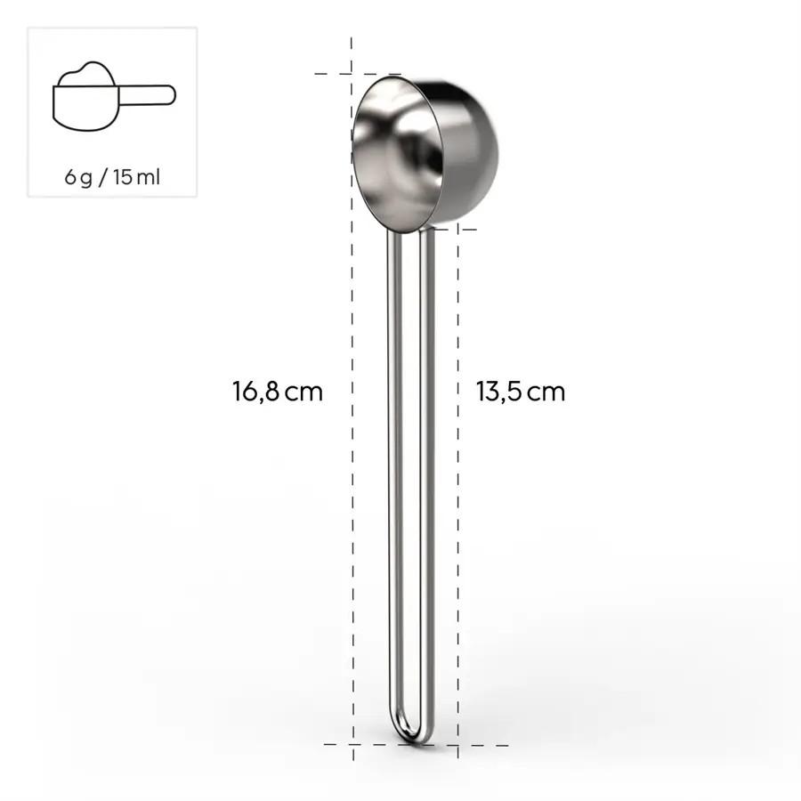 Odmerka na kávu, Mimoriadne kvalitná a odolná odmerka z ušľachtilej ocele, dlhá rúčka (13,5 cm) pre jednoduché nabratie aj zo dna nádoby.