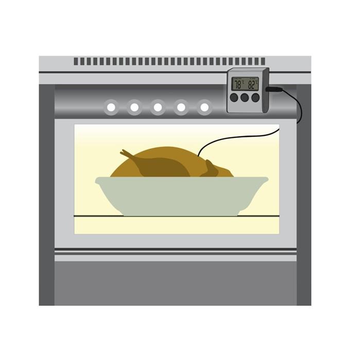 - digitálny teplomer na kontrolu vnútornej teploty jedla pri varení, pražení, pečení