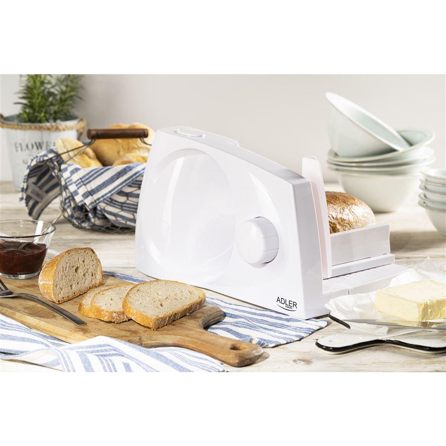 Kompaktný, bezpečný a ľahko skladateľný krájač potravín Adler AD4703 je ideálny na každodenné krájanie pomocou odnímateľného posúvača. Silný plast, z ktorého je vyrobený, uľahčuje prepravu. Kvalitná 17 cm čepeľ z nehrdzavejúcej ocele umožňuje krájať konzervované mäso na tenké plátky a krájať masívny plátok domáceho chleba. Hrúbku rezu je možné ľahko nastaviť. Celý krájač potravín možno ľahko rozobrať na kúsky, čo uľahčuje čistenie. Zaberá veľmi málo miesta. Vďaka možnosti skladania ho môžete po použití vložiť do kuchynskej skrinky. Bezpečnostné tlačidlo chráni pred náhodným zranením. Plastový posúvač je tiež navrhnutý na ochranu vašich prstov. Gumené nožičky bránia krájaču v pohybe.