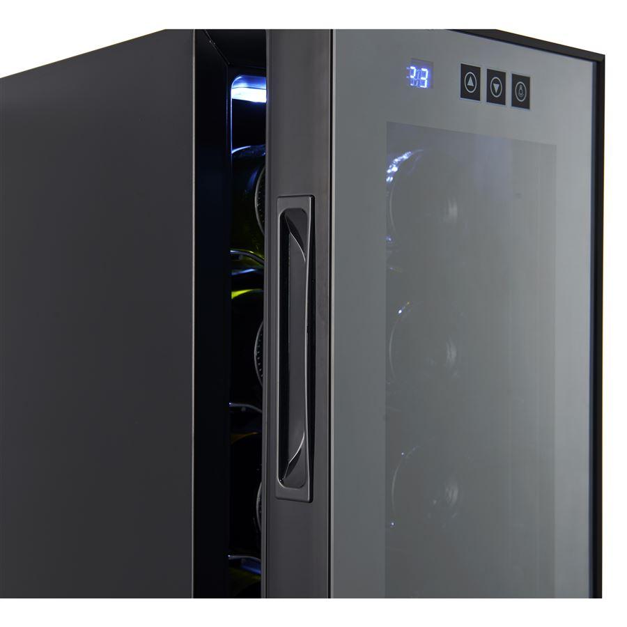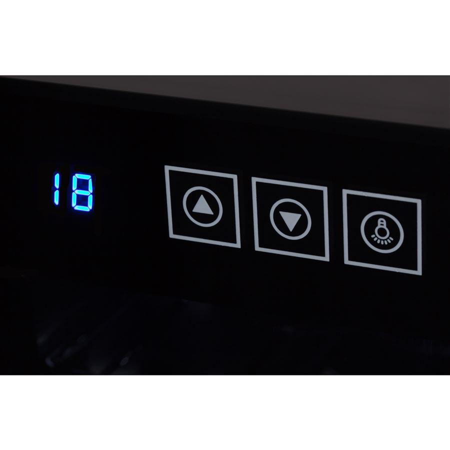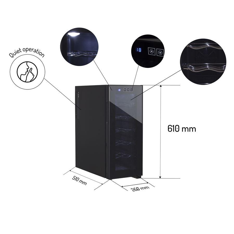 Jednou z kľúčových výhod tejto vinotéky je jej nízka energetická náročnosť, ktorá umožňuje využívať zariadenie hospodárne bez straty účinnosti. Vďaka termoelektrickému chladiacemu prvku funguje ticho a zaisťuje diskrétne a nenápadné používanie. Elegantný ovládací panel vybavený dotykovými tlačidlami zaisťuje jednoduché a intuitívne ovládanie. Regulácia teploty od 12 do 18 stupňov Celzia umožňuje prispôsobiť podmienky skladovania špecifickému charakteru nápojov. Vnútorné osvetlenie vinotéky navyše zaisťuje komfort používania a izolované bezpečnostné sklo s UV filtrami chráni uskladnené nápoje pred škodlivými účinkami žiarenia. Vhodné chladenie založené na Peltierovej technológii zaručuje udržanie optimálnej teploty vo vnútri zariadenia. Je tu použitý termoelektrický článok, ktorý eliminuje pretrvávajúce bzučanie a hlasný chod zariadenia.