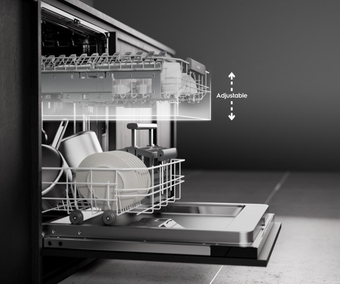 - Výškovo nastaviteľný horný košík, dokonca aj pri plnom naložení Horný