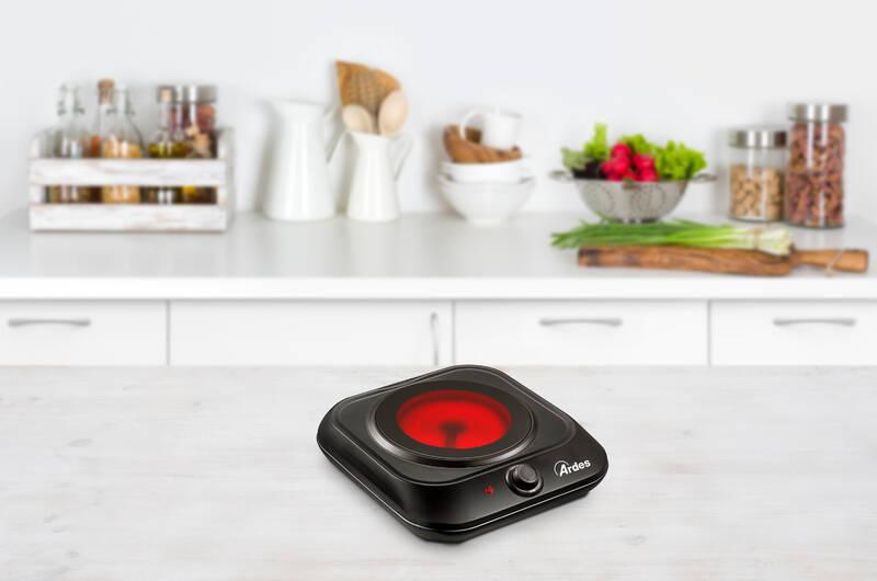 Ať už se chystáte na chalupu, dovolenou nebo jinou cestu, sklokeramický elektrický vařič Ardes 1F401 je kompaktní a užitečný pomocník, s jehož pomocí ohřejete vodu na čaj nebo uvaříte jednoduché jídlo v jedné pánvi. Zařízení má příkon 1 200 W.