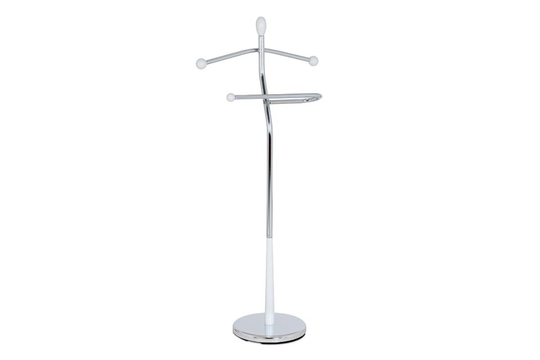 Praktický minimalistický nemý sluha v sebe kombinuje prvky z masívneho kaučukovníkového dreva s kovovými nosnými dielmi v chrómovanej povrchovej úprave. Tento model je ladený seversky, v bielom matnom laku. Výška 118 cm Vám umožní zavesenie oblečenia aj doplnkov úplne bez pokrčenia. Nosnosť stojana je až 5 kg rovnomerne rozprestretej záťaže, hmotnosť 5 kg. Konštrukcia je zakončená kovovou chrómovanou podestou so záťažou v čiernom plastovom puzdre. Stojan je jednoducho prenositeľný a je možné ho umiestniť podľa momentálnej potreby aj nálady. Štýlom a jednoduchosťou sa hodí do akéhokoľvek interiéru. Využitie je nepreberné, záleží len na Vás.
