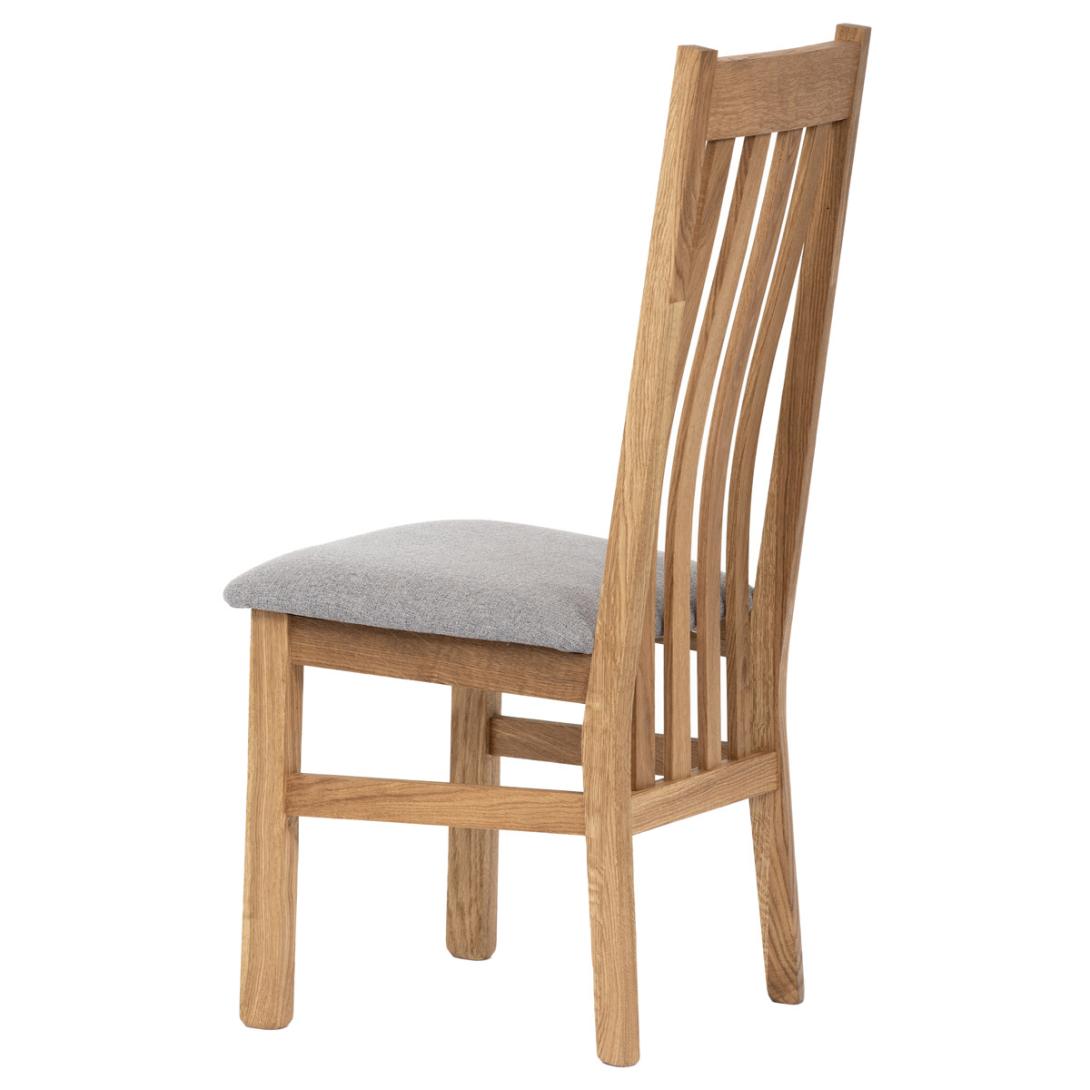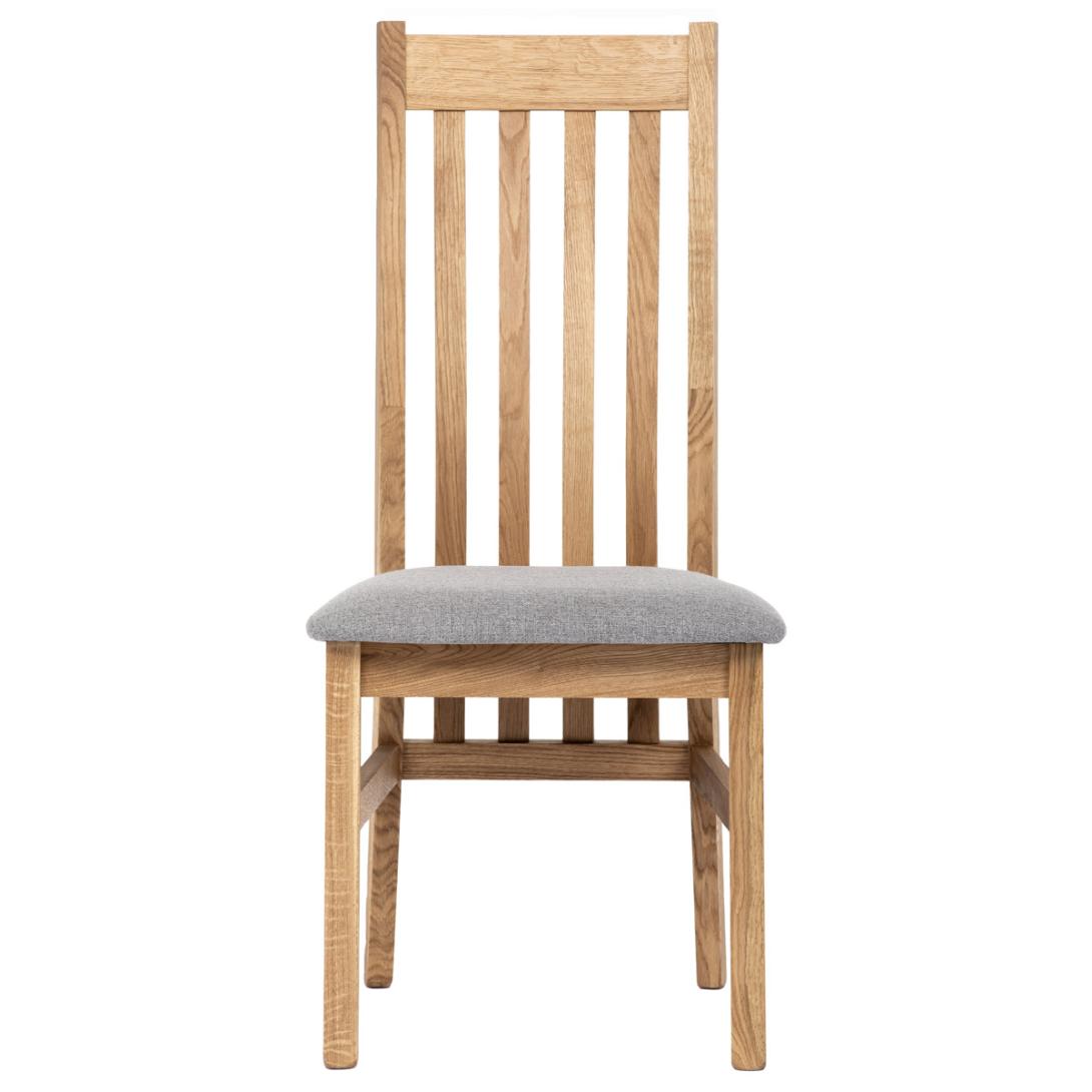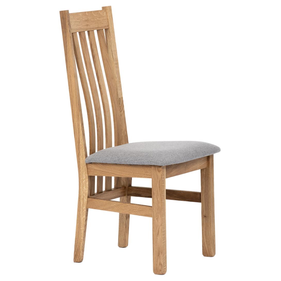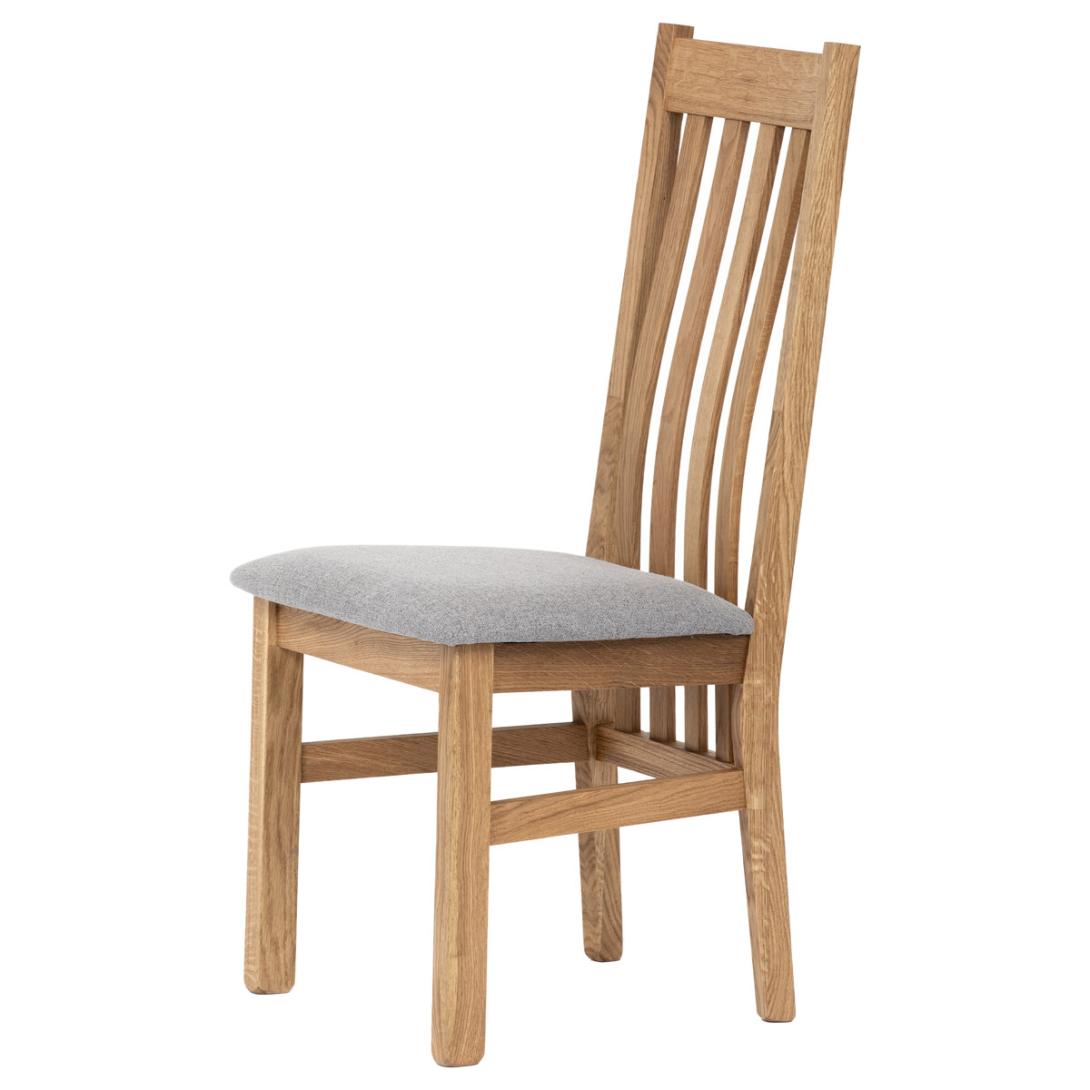 Dřevěná jídelní židle z masivního dubového dřeva je demonstrací dokonalé řemeslné práce. Zaujme nejen svým rustikálním stylem, ale i perfektním zpracováním. Styl vychází z minimalistického severského designu, v temnějším nádechu přírodního odstínu. Tato barevnost skvěle vykreslí léta dubu a podtrhne její provedení. Čisté linie a vysoce kvalitní řemeslné zpracování dřevěného masivu nastavuje okouzlující akcenty a podtrhuje útulnou atmosféru v interiéru. Tato židle Vás zve nejen k odpočinku, ale rozjímání s rodinou i přáteli, kde oceníte ergonomicky tvarované vzpěry opěradla, kopírující zakřivení páteře. Pohodlný sedák je potažen odolnou látkou z polyesterových vláken, v stříbřitém barevném odstínu. Polstrování je kvalitní PU pěnou. O kvalitě potahové látky Vás jistě přesvědčí její parametry - gramáž 340 g/m2, martindale naprosto skvělých 80 000 cyklů a barevná stálost na světle je na stupni 5.Povrchová úprava dubové masivní konstrukce je tvrdovoskovým olejem, speciálně určeným pro dlouhodobé ošetření dřeva. Velkým bonusem této židle je její dodání v kompletně smontovaném stavu a se spoji lepenými (!). Tím odpadá nejen nepříjemné studium montážního návodu a následně i montáž, ale židle bude stále pevná a nehrozí, že budete muset v pravidelných cyklech utahovat povolené šrouby.Další pevnostní prvek slouží i trnože mezi nohama. Toto vše dělá ze židle pevný a velice trvanlivý celek s nosností až 140 kg.Elegantním prvkem bude v klasicky laděných interiérech společně s masivním dubovým stolem, ale i kombinace se stolem ve stylu Loft bude velmi zajímavá a nepřehlédnutelná.