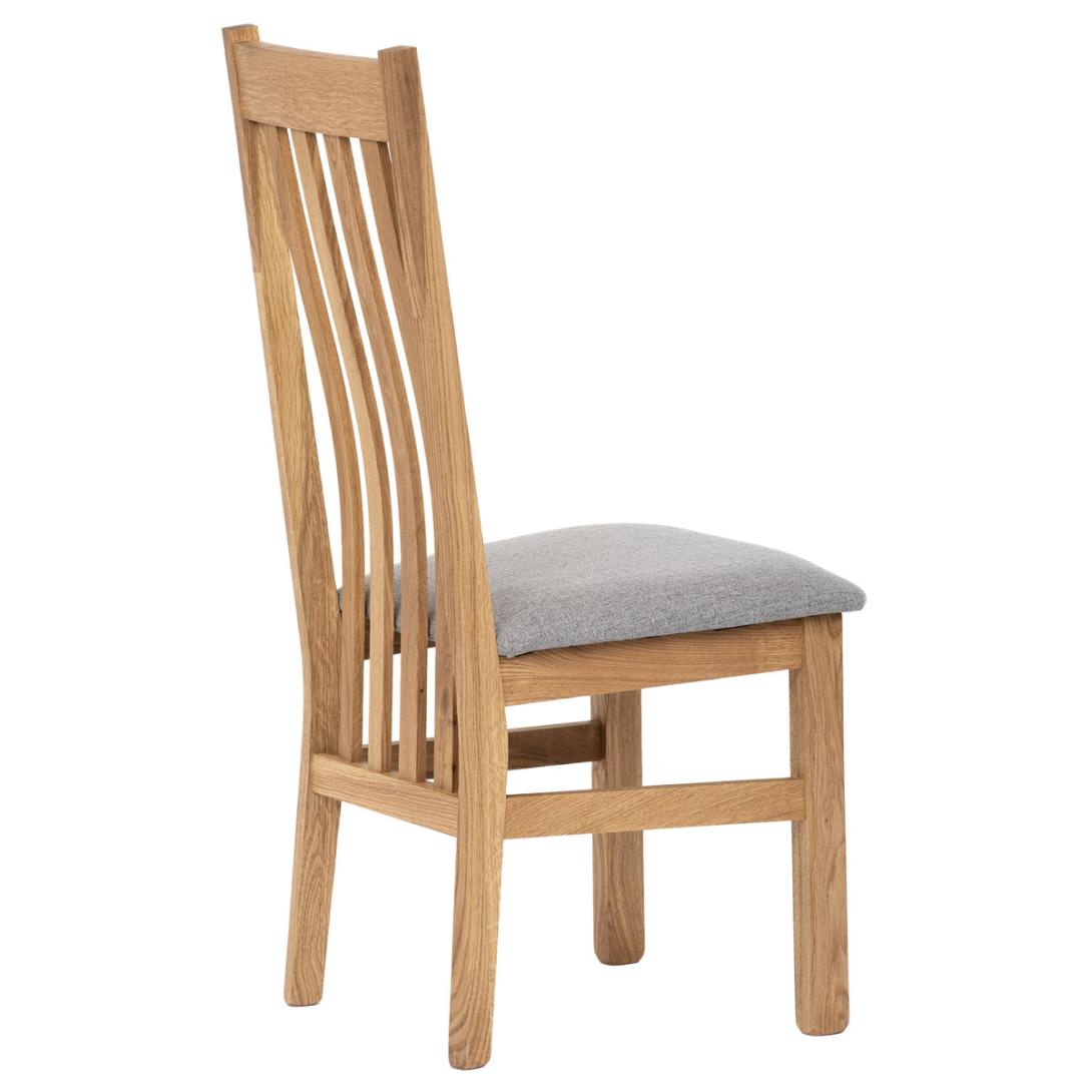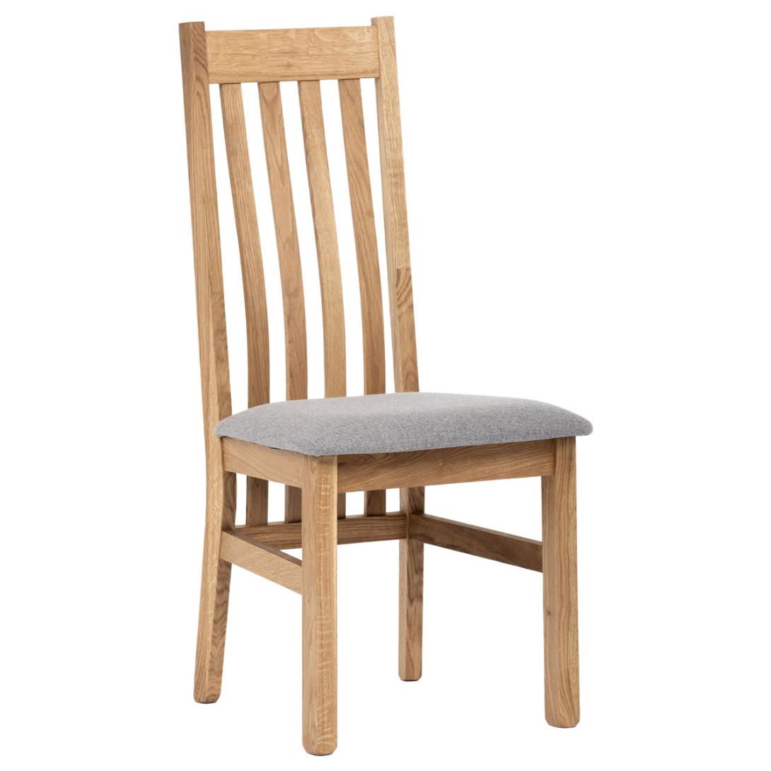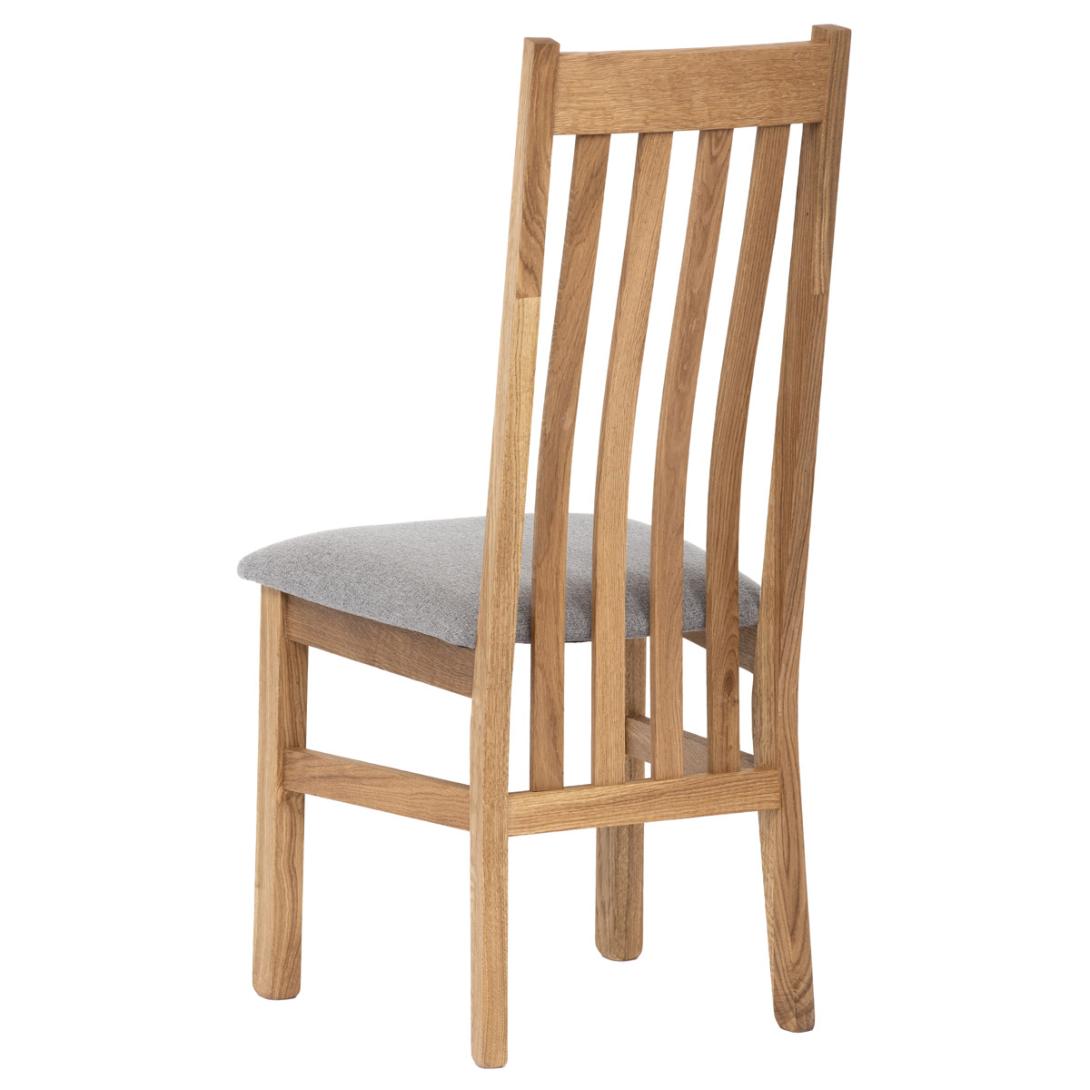 Dřevěná jídelní židle z masivního dubového dřeva je demonstrací dokonalé řemeslné práce. Zaujme nejen svým rustikálním stylem, ale i perfektním zpracováním. Styl vychází z minimalistického severského designu, v temnějším nádechu přírodního odstínu. Tato barevnost skvěle vykreslí léta dubu a podtrhne její provedení. Čisté linie a vysoce kvalitní řemeslné zpracování dřevěného masivu nastavuje okouzlující akcenty a podtrhuje útulnou atmosféru v interiéru. Tato židle Vás zve nejen k odpočinku, ale rozjímání s rodinou i přáteli, kde oceníte ergonomicky tvarované vzpěry opěradla, kopírující zakřivení páteře. Pohodlný sedák je potažen odolnou látkou z polyesterových vláken, v stříbřitém barevném odstínu. Polstrování je kvalitní PU pěnou. O kvalitě potahové látky Vás jistě přesvědčí její parametry - gramáž 340 g/m2, martindale naprosto skvělých 80 000 cyklů a barevná stálost na světle je na stupni 5.Povrchová úprava dubové masivní konstrukce je tvrdovoskovým olejem, speciálně určeným pro dlouhodobé ošetření dřeva. Velkým bonusem této židle je její dodání v kompletně smontovaném stavu a se spoji lepenými (!). Tím odpadá nejen nepříjemné studium montážního návodu a následně i montáž, ale židle bude stále pevná a nehrozí, že budete muset v pravidelných cyklech utahovat povolené šrouby.Další pevnostní prvek slouží i trnože mezi nohama. Toto vše dělá ze židle pevný a velice trvanlivý celek s nosností až 140 kg.Elegantním prvkem bude v klasicky laděných interiérech společně s masivním dubovým stolem, ale i kombinace se stolem ve stylu Loft bude velmi zajímavá a nepřehlédnutelná.