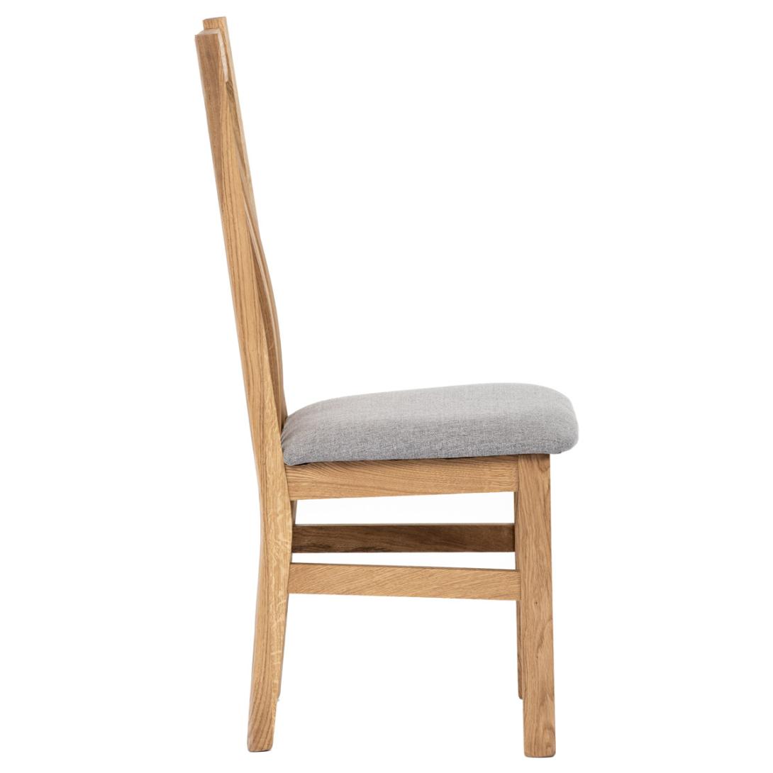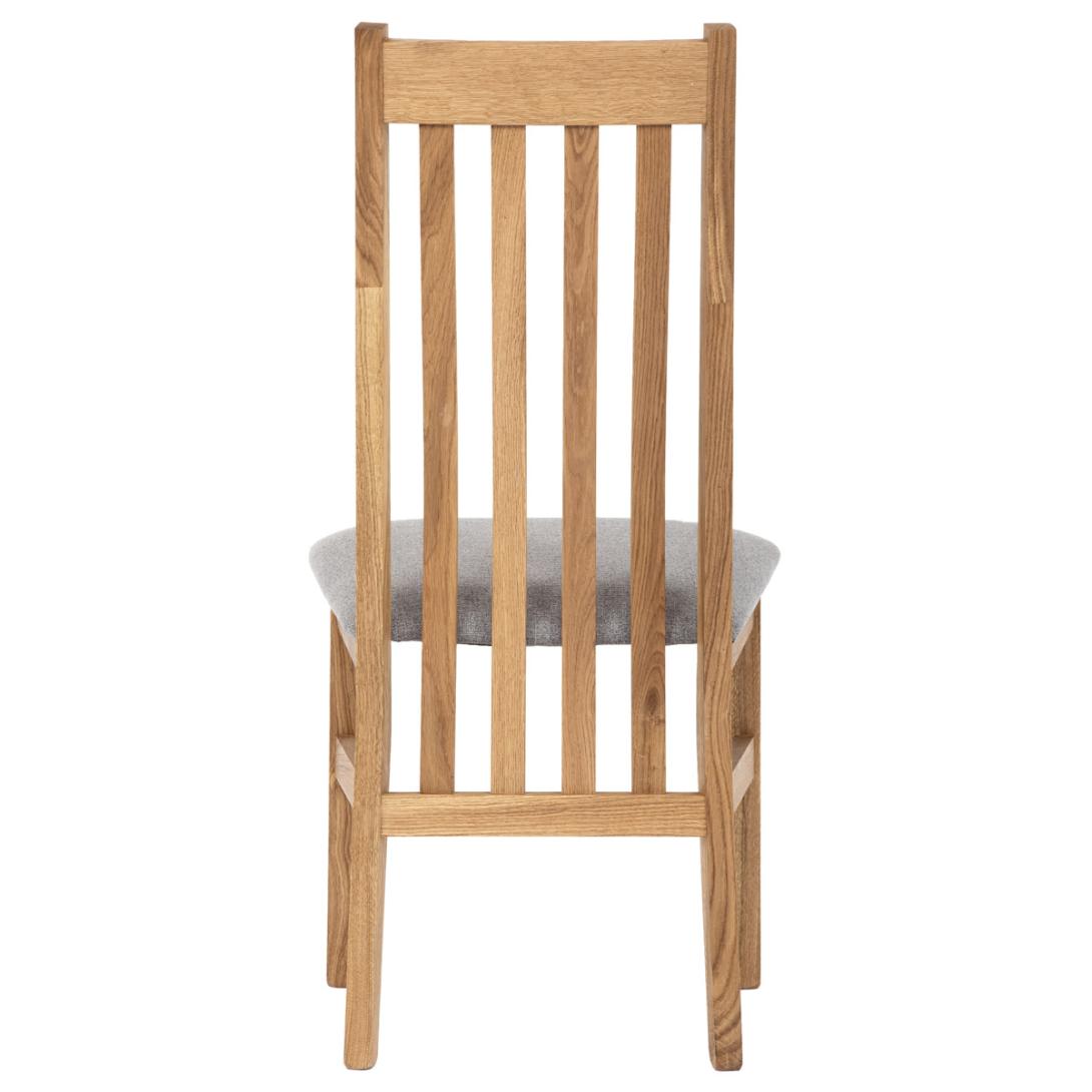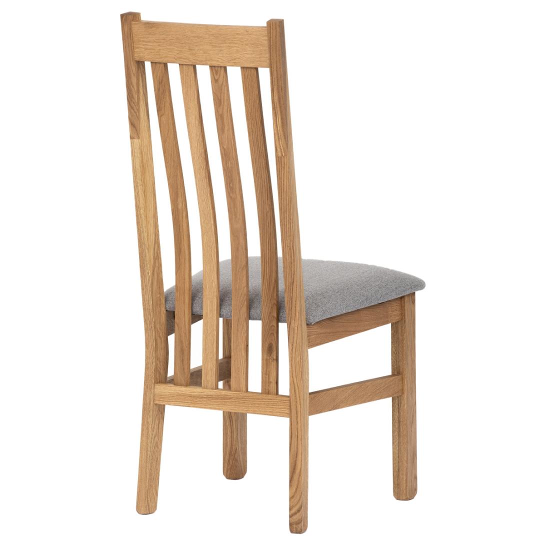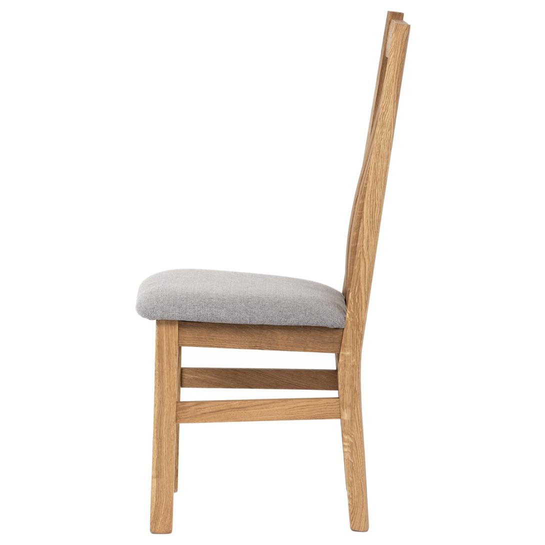 Dřevěná jídelní židle z masivního dubového dřeva je demonstrací dokonalé řemeslné práce. Zaujme nejen svým rustikálním stylem, ale i perfektním zpracováním. Styl vychází z minimalistického severského designu, v temnějším nádechu přírodního odstínu. Tato barevnost skvěle vykreslí léta dubu a podtrhne její provedení. Čisté linie a vysoce kvalitní řemeslné zpracování dřevěného masivu nastavuje okouzlující akcenty a podtrhuje útulnou atmosféru v interiéru. Tato židle Vás zve nejen k odpočinku, ale rozjímání s rodinou i přáteli, kde oceníte ergonomicky tvarované vzpěry opěradla, kopírující zakřivení páteře. Pohodlný sedák je potažen odolnou látkou z polyesterových vláken, v stříbřitém barevném odstínu. Polstrování je kvalitní PU pěnou. O kvalitě potahové látky Vás jistě přesvědčí její parametry - gramáž 340 g/m2, martindale naprosto skvělých 80 000 cyklů a barevná stálost na světle je na stupni 5.Povrchová úprava dubové masivní konstrukce je tvrdovoskovým olejem, speciálně určeným pro dlouhodobé ošetření dřeva. Velkým bonusem této židle je její dodání v kompletně smontovaném stavu a se spoji lepenými (!). Tím odpadá nejen nepříjemné studium montážního návodu a následně i montáž, ale židle bude stále pevná a nehrozí, že budete muset v pravidelných cyklech utahovat povolené šrouby.Další pevnostní prvek slouží i trnože mezi nohama. Toto vše dělá ze židle pevný a velice trvanlivý celek s nosností až 140 kg.Elegantním prvkem bude v klasicky laděných interiérech společně s masivním dubovým stolem, ale i kombinace se stolem ve stylu Loft bude velmi zajímavá a nepřehlédnutelná.