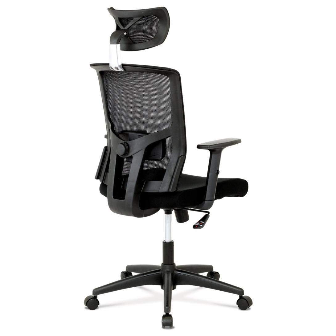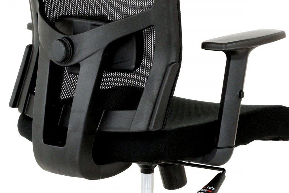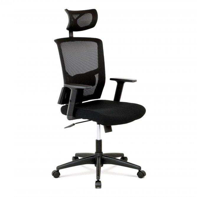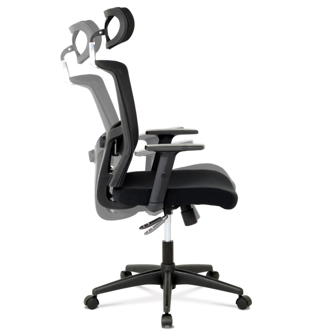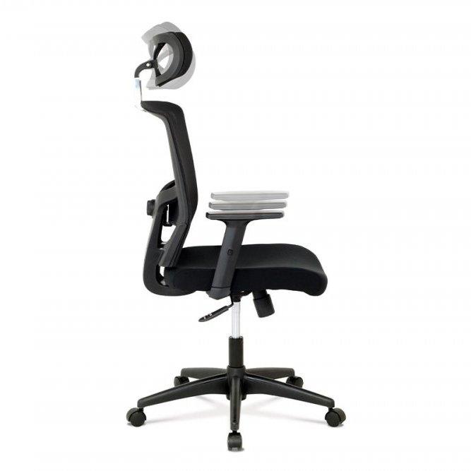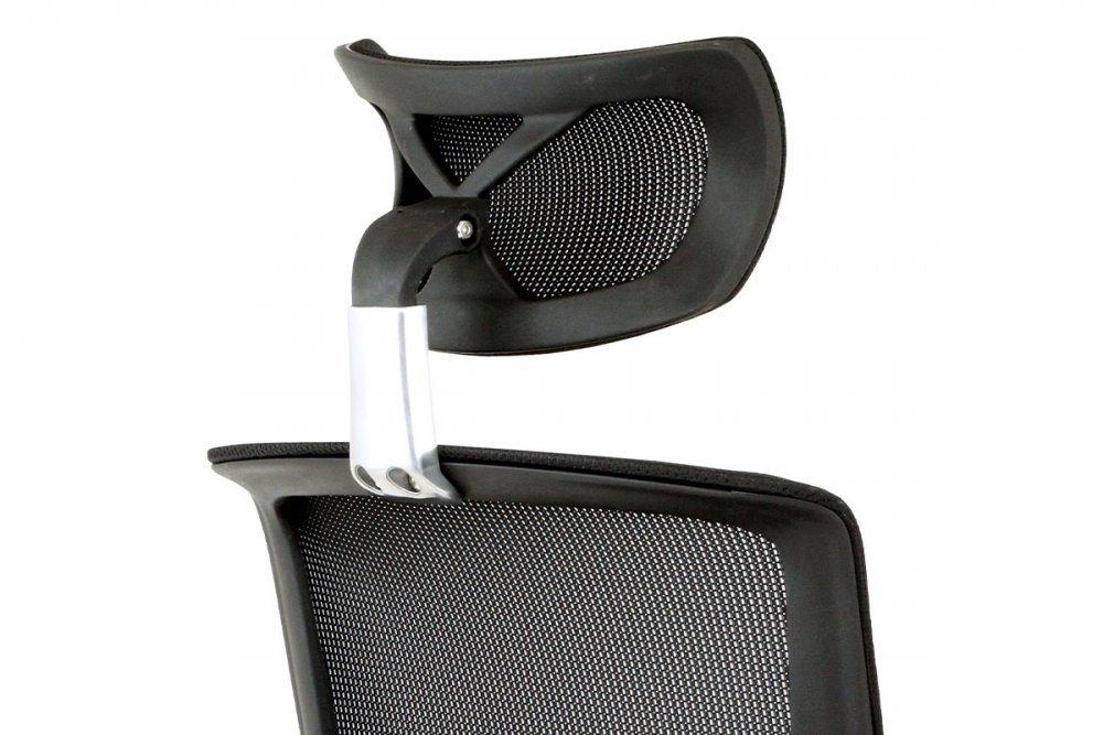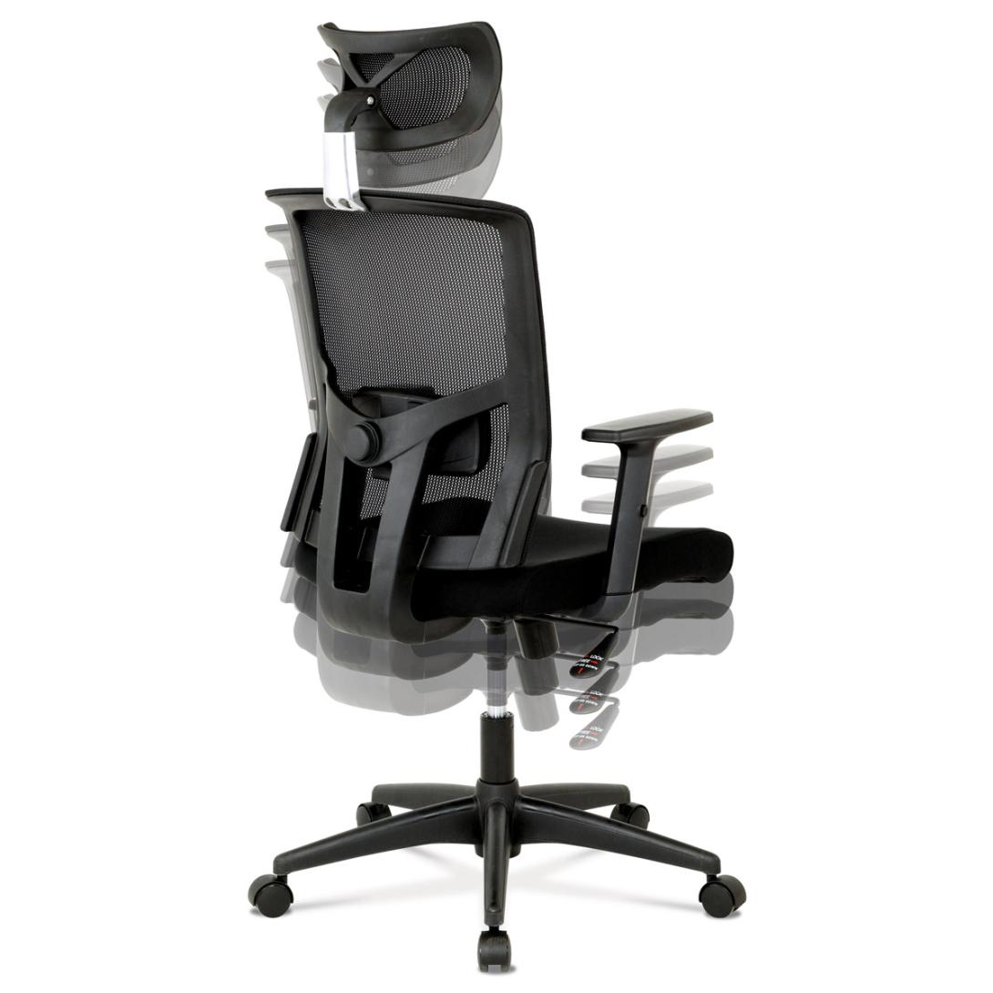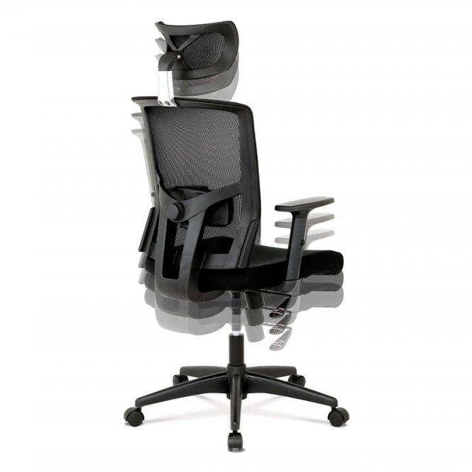 Kancelárska stolička s výškovo nastaviteľnými podrúčkami, pasívnou bedrovou opierkou, polohovacou opierkou hlavy a plastovým krížom s plastovými kolieskami vhodnými na koberce.