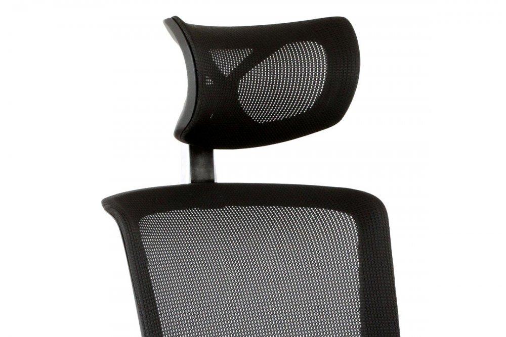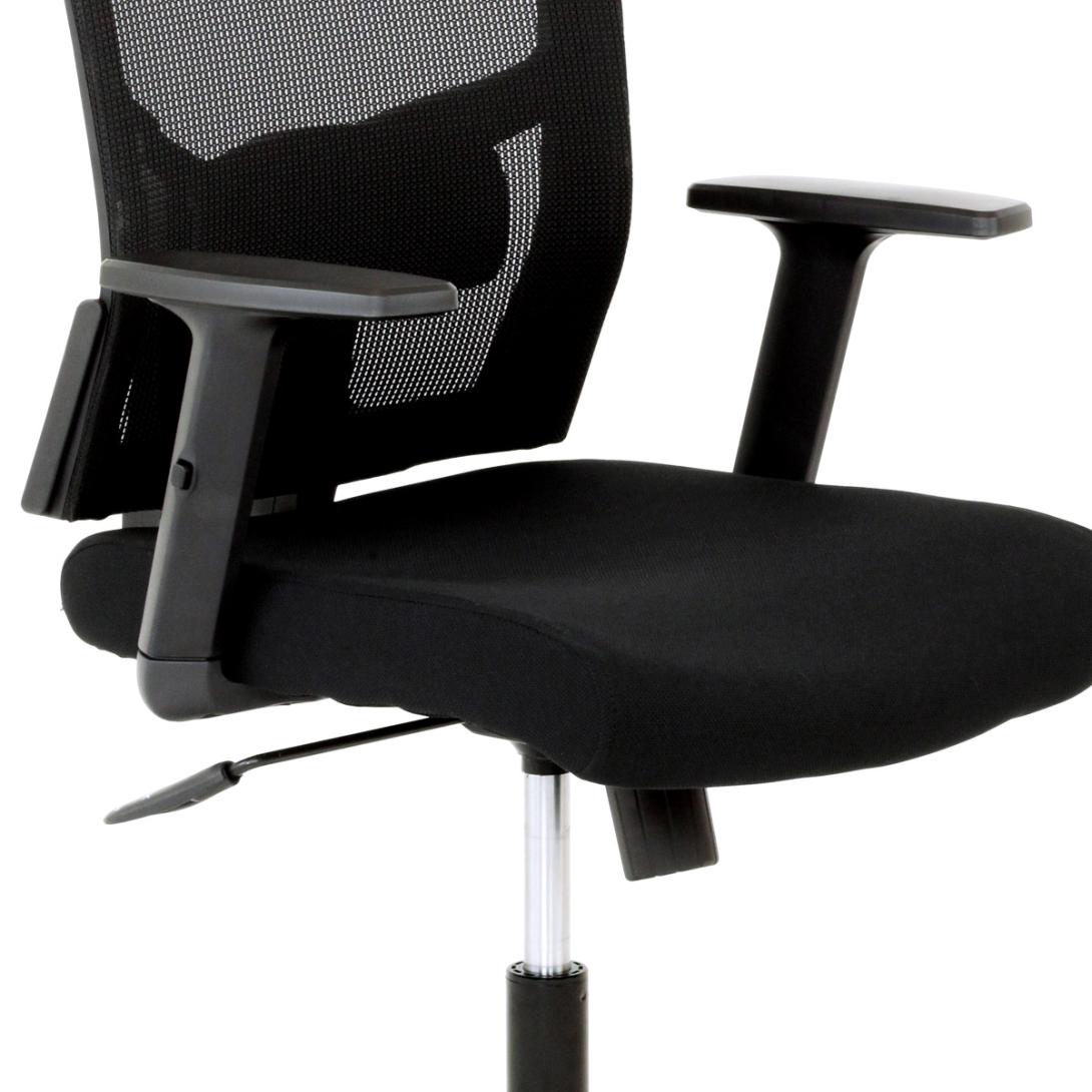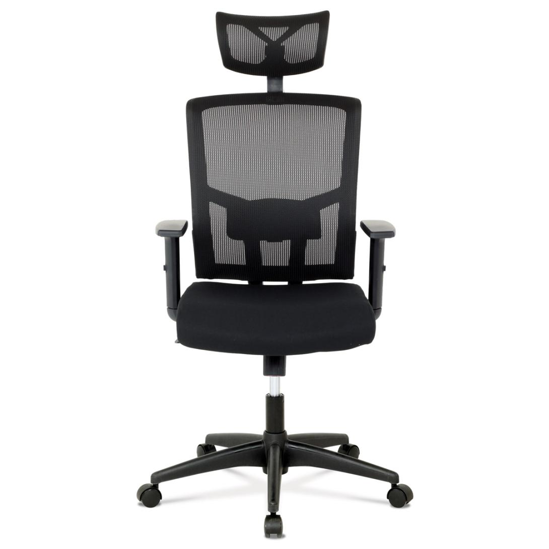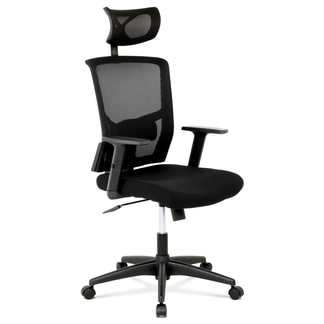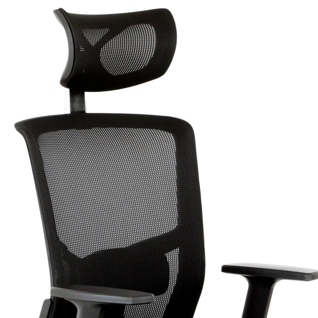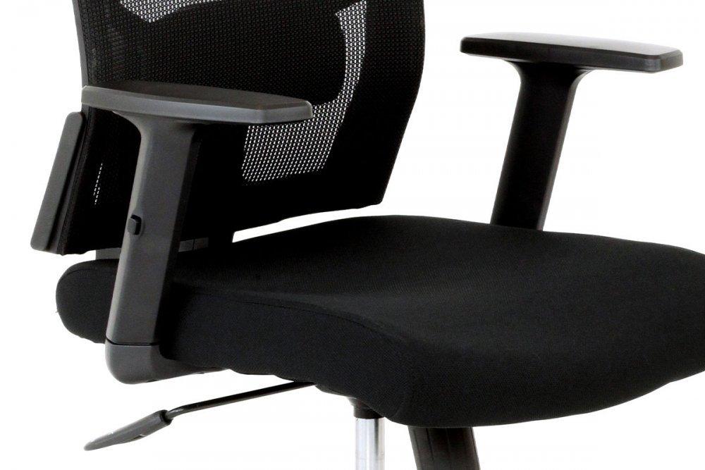 Kancelárska stolička s výškovo nastaviteľnými podrúčkami, pasívnou bedrovou opierkou, polohovacou opierkou hlavy a plastovým krížom s plastovými kolieskami vhodnými na koberce.