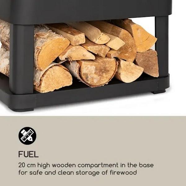 - Palivo: 20 cm vysoký priečinok na drevo v základni pre bezpečné a čisté skladovanie palivového dreva