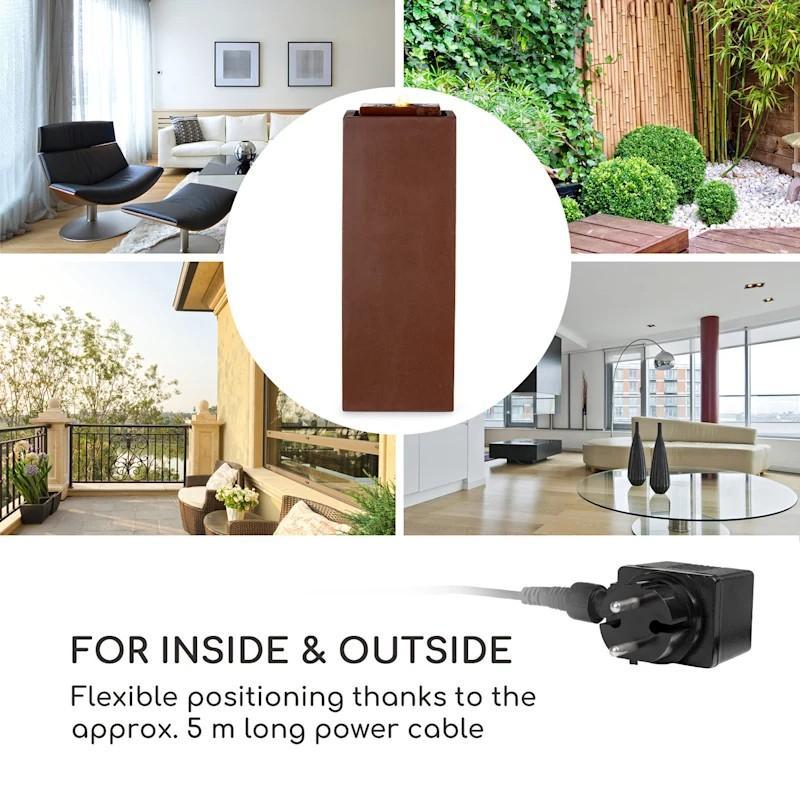 Záhradná fontána Messina je svojimi rozmermi 30 x 84 x 30 cm (Š x V x H) príjemne kompaktná a vďaka svojmu štýlovému dizajnu naplní obývacie izby a záhrady príjemnou a pokojnou atmosférou. Vďaka decentnému LED osvetleniu má fontána mimoriadny lesk a aj vo večerných a nočných hodinách je estetickým stredobodom okolia. V byte má okrasná fontána okrem relaxačného efektu aj ďalší pozitívny vplyv na zdravie: automaticky zvlhčuje vzduch, zlepšuje vnútorné prostredie a umožňuje dýchať svieži vzduch. Čerpadlo fontány udržuje uzavretý vodný obeh v chode neprerušovane s úsporným výkonom 2,5 W a pracuje príjemne ticho aj pri nepretržitej prevádzke. Vďaka vyhotoveniu z cementu je záhradná fontána optimálne chránená pred vetrom a počasím. Môže sa preto umiestniť a obdivovať vonku po celý rok. Vďaka zafarbeniu v medenom odtieni a pokojnému pôsobeniu sa záhradná fontána Messina dokonale začlení do akéhokoľvek záhradného aj obytného prostredia. 5 metrov dlhý napájací kábel uľahčuje výber miesta a pomáha s flexibilným umiestnením.