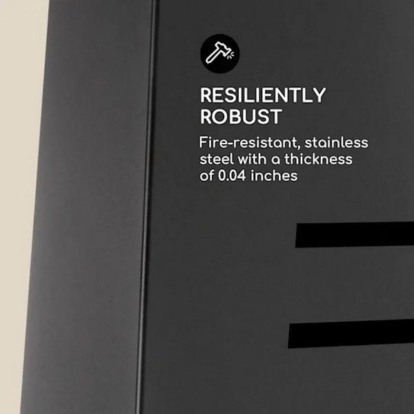 - nezničiteľne masívny: vyrobený z nehorľavej, nehrdzavejúcej ocele s hrúbkou 1,2 mm