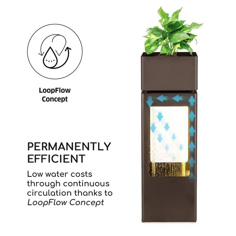 Voda osvetlená 50 cm dlhou LED svetelnou lištou zurčí stekajúc v neustálom prúde a postará sa o meditatívne uvoľnenie. Fontána Waterplant zhotovená z pozinkovaného kovu je pritom mimoriadne masívna a odolná. Aby sa vodná hra nikdy neunavila, pumpa s výkonom 16 W zabezpečí neustálu cirkuláciu vody. Vďaka extra dlhému sieťovému káblu s dĺžkou 10 m je možné záhradnú fontánu voľne umiestniť, všade si nájde perfektné miesto. Mimoriadny highlight je kvetináč pekného tvaru, ktorý do každej domácnosti prináša dodatočnú eleganciu.