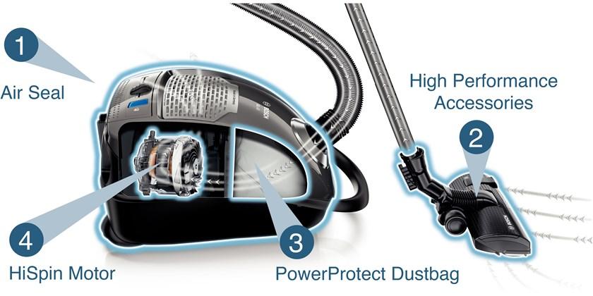- PowerProtect System: pre dlhotrvajúci výkon vysávania, aj keď je vrecko už plné.