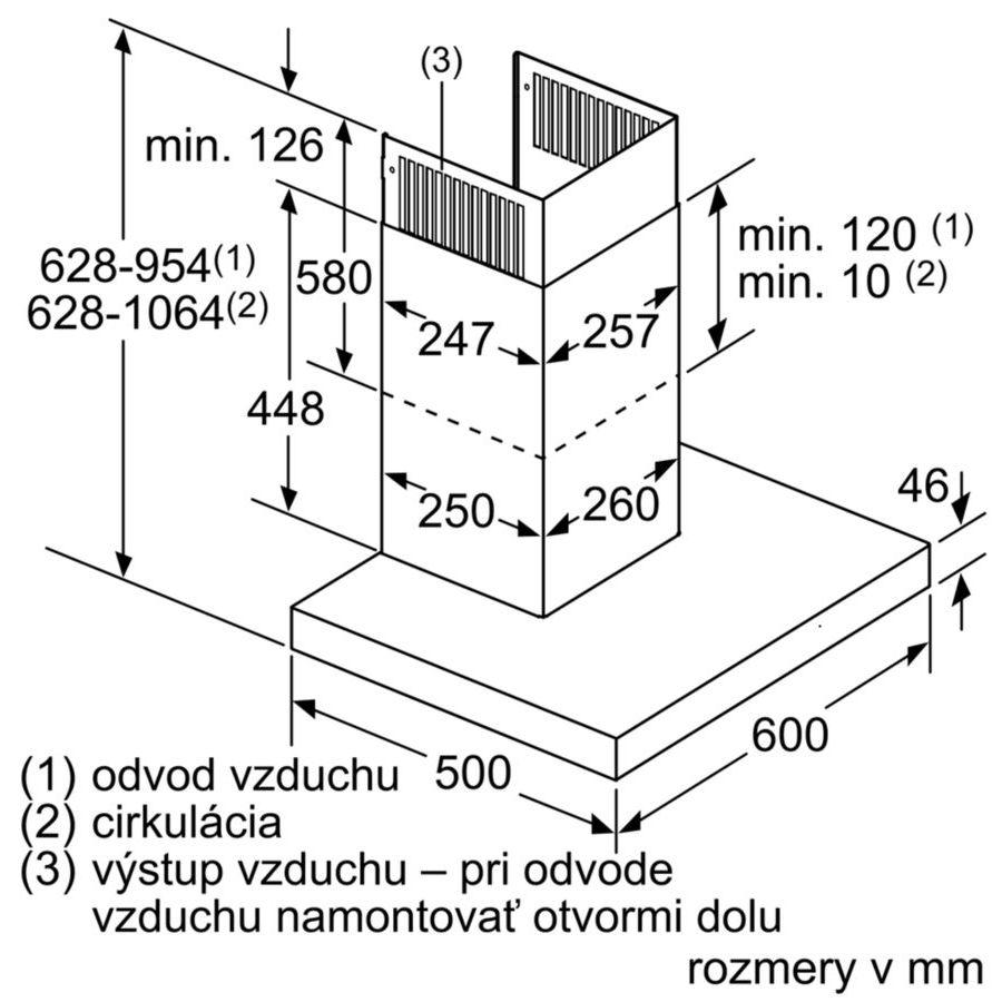 - rozmery pri recirkulácii (VxŠxH): 628-1064 x 598 x 500 mm
