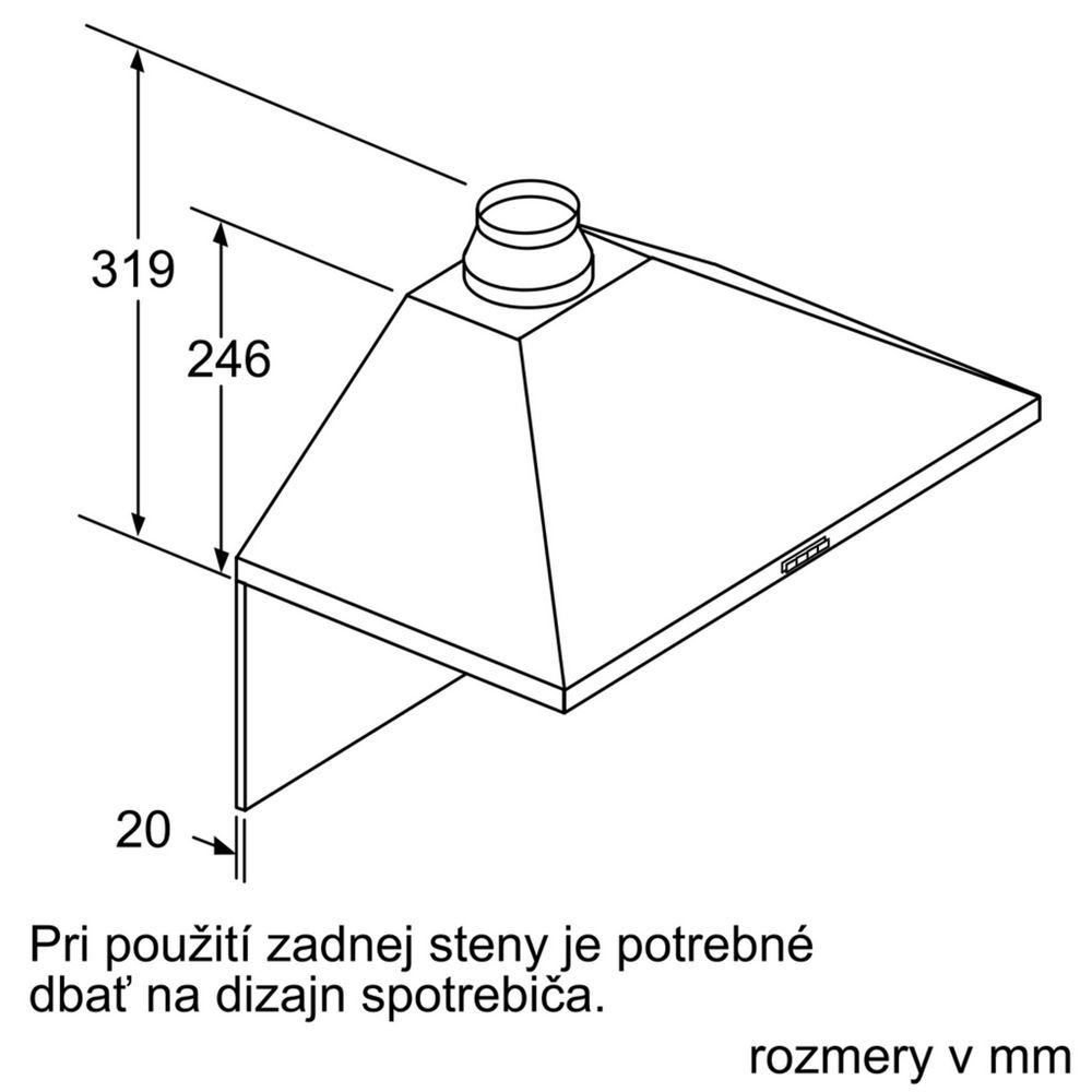 Komínový odsávač pár, farba: nerez, šírka: 90 cm, 3 výkonové stupne cez tlačidlový prepínač, osvetlenie: 2 x 1,5W LED, max. bežný stupeň: 213 m³/h, max. bežný stupeň: 67 dB(A), príkon: 100 W