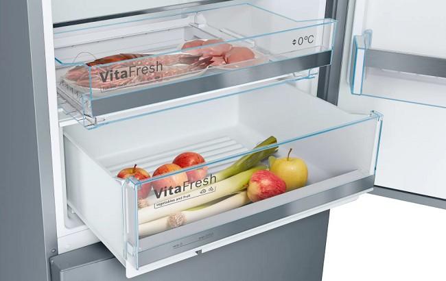 Chladiaca časť kombinovanej chladničky značky Bosch s vnútorným objemom 302 litrov disponuje 5 odkladacími sklenenými poličkami (z toho 2 poličky si viete výškovo nastaviť). Štyri police vo dverách sú vyrobené z plastu a využijete ich na odloženie fliaš či vajíčok. Okrem toho je vybavená dvoma zásuvkami VitaFresh. Vrchná zásuvka je určená na uloženie mäsa a rýb. Zásuvka VitaFresh s reguláciou vlhkosti je ideálna na uskladnenie ovocia a zeleniny. Vďaka tejto Fresh zóne zostanú vaše potraviny dlhšie čerstvé.