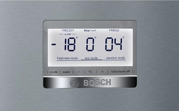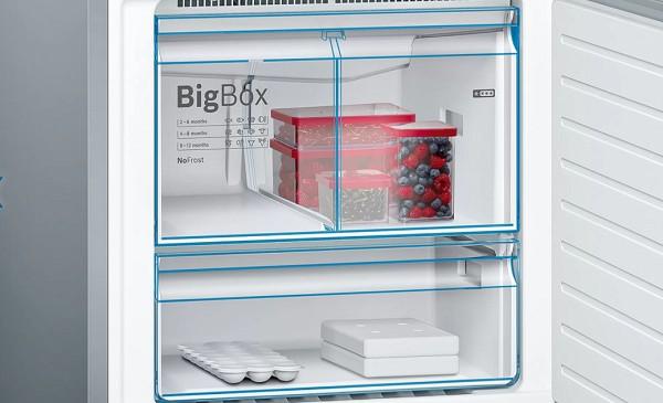 Kombinovaná chladnička Bosch v nerezovom prevedení s integrovaným vertikálnym madlom má výšku 193 cm. Do chladničky s objemom až 375 litrov sa zmestí nákup pre celú vašu rodinu. Vo vnútri chladničky nájdete až 4 EasyAccess police, držiak na fľaše a dva VitaFresh boxy s reguláciou vlhkosti ideálny pre uskladnenie ovocia a zeleniny. Vo dverách chladničky nájdete ešte ďalšie 3 poličky, ideálne na odloženie vajíčok, masla alebo fliaš.