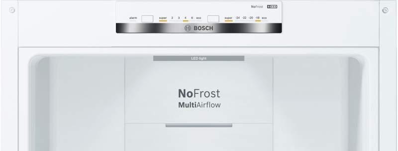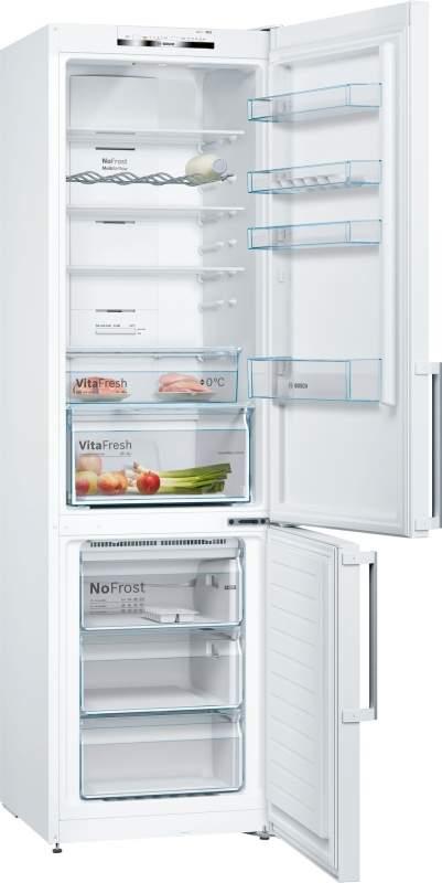 Kombinovaná chladnička Bosch KGN39VWEP v bielom m prevedení s vertikálnym madlom má výšku 203 cm. Inteligentná invertorová technológia zabezpečuje inteligentnú interakciu medzi senzomi, elektronikou a kompresorom. Senzory nepretržite monitorujú vo vnútri chladničky a jej okolí. Elektronický systém okamžite zaznamená zmeny a kompresor následne prispôsobuje svoj výkon k aktuálnej situácii. S technológiou NoFrost už odmrazovanie nebude nutné. Chladnička aj mraznička sa odrmazujú automaticky. Prednosťami chladničky sú: