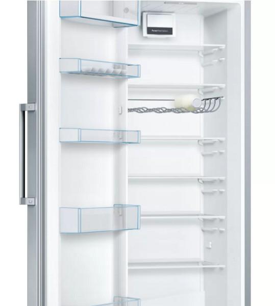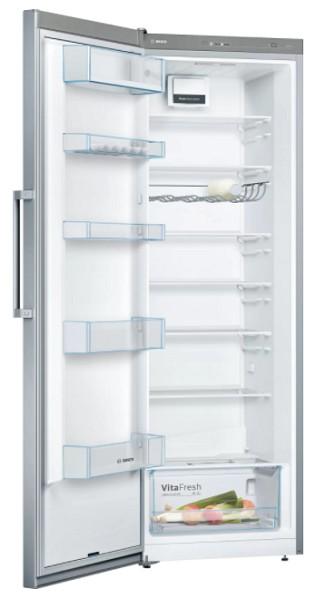 Voľne stojaca jednodverová chladnička Bosch KSV29NWEP v nezerovom prevedení s celkovým objemom 324 litrov si nájde miesto aj vo vašej kuchyni a bez problémov sa do nej zmestí váš rodinný nákup. Okrem toho je vybavená technológiou NoFrost, s ktorou môžete zabudnúť na zdĺhavé odmrazovanie. Chladnička sa odmrazí sama, čo šetrí váš čas. Pre pohodlné otváranie je z vonkajšej strany dvierok umiestnené praktické madlo. Je obzvlášť vhodná do domácností, kancelárií alebo na chatu. Vo vnútri nájdete dostatok priestoru pre vaše potraviny. Má špeciálne poličky Easy Access, ktoré ponúkajú dokonalý prehľad a jednoduché uskladnenie. Sú odolné voči nárazu. Mechanizmus plynulého vysúvania umožňuje ich pohodlné využitie. Vnútro chladničky ešte obsahuje: