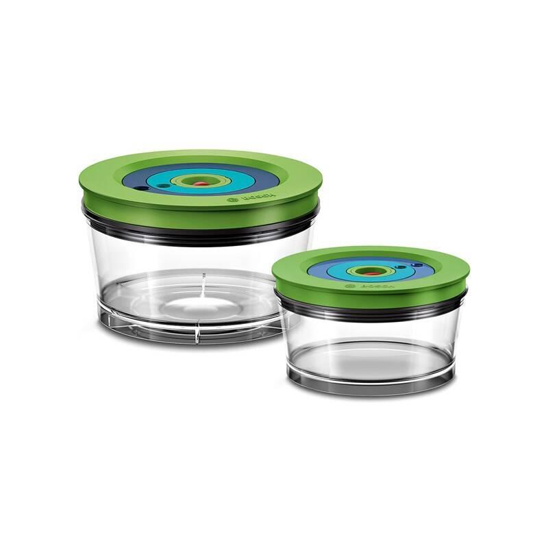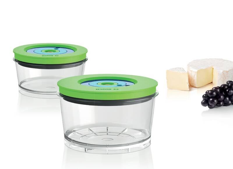 Súprava dvoch praktických dóz Bosch MMZV0SB2 patrí medzi príslušenstvo k vákuovému systému Bosch. Na jednoduché uskladňovanie potravín a predchádzanie plytvaniu sú dózy ideálne. S veľkým objemom 1,5 l alebo menším 750 ml môžete uskladniť napr. ovocie, koreniny, kávu alebo hotové jedlo. Potraviny, ktoré sú zavákuované, vydržia až 2× dlhšie čerstvé. Dózy sú vyrobené z tritanu, ktorý je odolný proti rozbitiu, chuťovo aj pachovo neutrálny. Môžete ich vložiť do mikrovlnnej rúry alebo umývačky riadu. Všetky plasty sú bez BPA. Na vákuovanie využijete nadstavce ErgoMixx, MaxoMixx alebo ručný šľahač s vákuovým systémom.