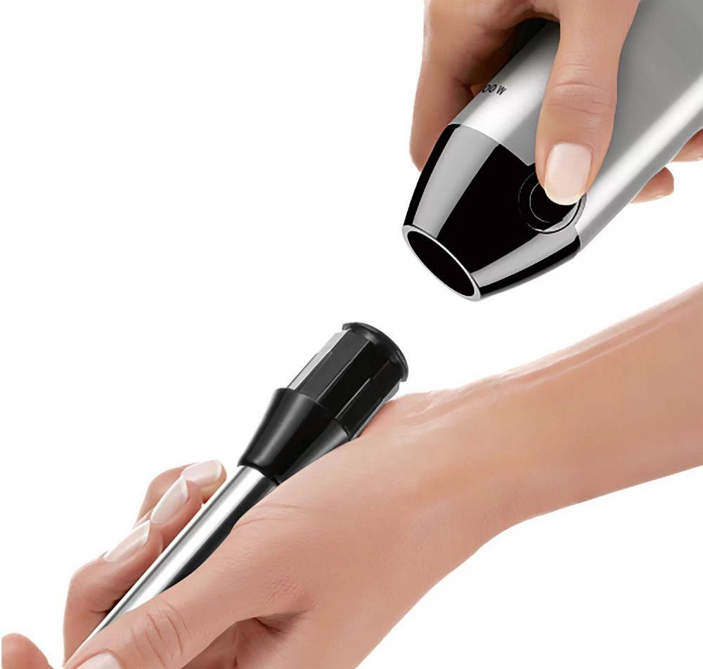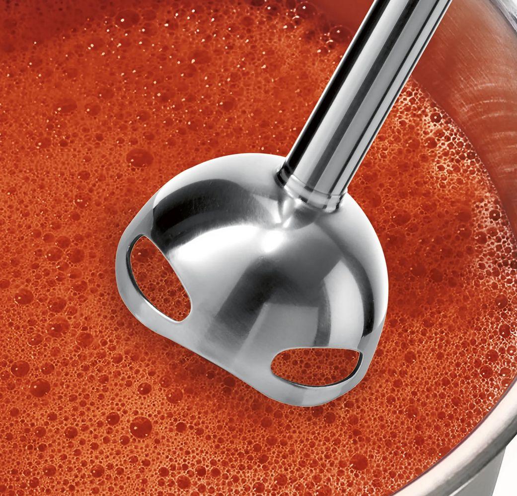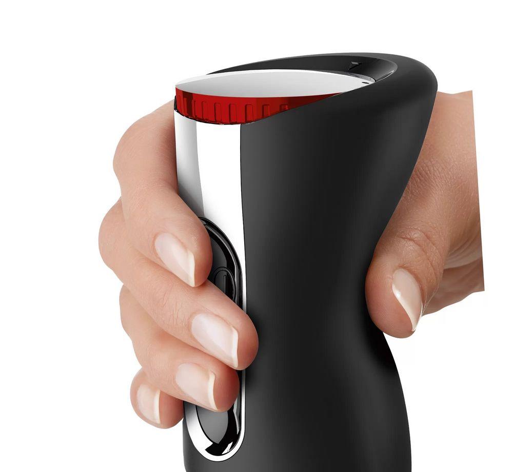 Štýlové mixovanie nebolo nikdy pohodlnejšie. Plášť z nehrdzavejúcej ocele je zárukou dlhotrvajúcej kvality. Vďaka štíhlemu, ergonomickému tvaru mäkčenej rukoväte sa mixér pohodlne a bezpečne drží.