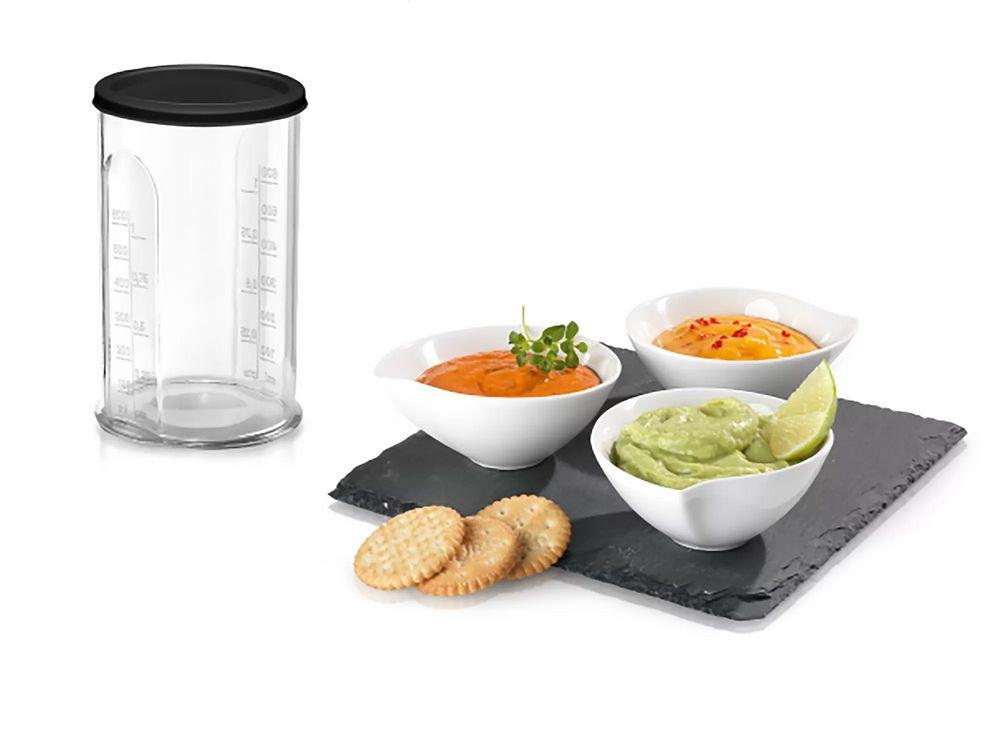Pracujete často s malým množstvom surovín? Mixovacia nádoba je perfektná pre odmeranie a rozmixovanie malých dávok. Vďaka vrchnáku môžete vami pripravené dresingy alebo iné nasekané ingrediencie ukladať priamo do chladničky.