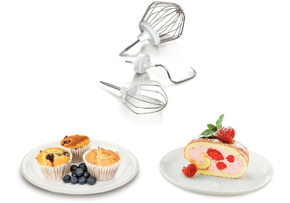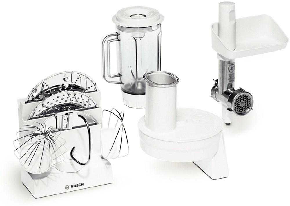 - Mnohostranne využiteľný set (šľahacie metly, hnetacie háky), priebehový krájač so 4 kotúčmi (krájacie, strúhaciu, stouhací a kotúč na knedle), mixér, mlynček na mäso, držiak na príslušenstvo