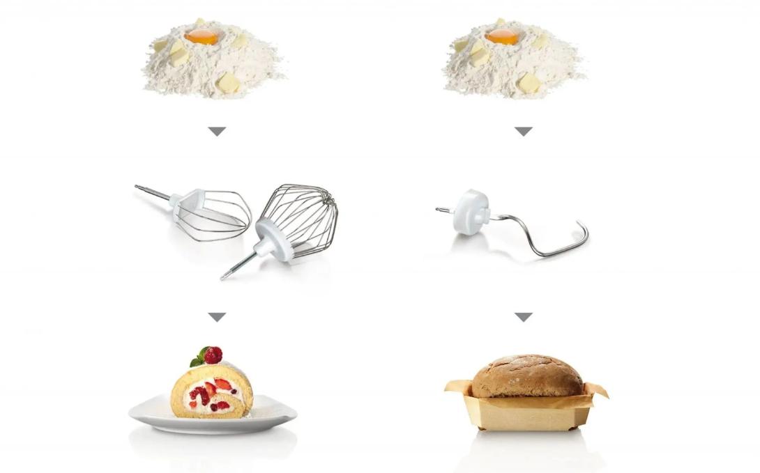 - Veľká multifunkčnosť vďaka kvalitnej cukrárenskej sade (miešacia metla, šľahacia metlička, hnetací hák) a naviac priebehový krájač s tromi kotúčmi na krájanie, strúhanie a rezanie.