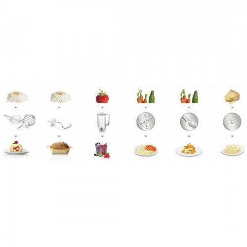 - Veľká multifunkčnosť vďaka kvalitnej cukrárenskej sade (miešacia metla, šľahacia metlička, hnetací hák) a naviac priebehový krájač s tromi kotúčmi na krájanie, strúhanie a rezanie, plus plastový mixér.