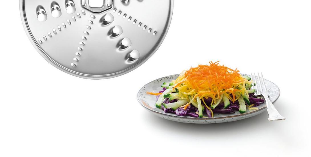 - Päť rôznych kotúčov vám umožní jednocho a rýchlo pripraviť tie najrôznejšie prísady a potraviny (sekanie, krájanie, strúhanie vrátane krájače na prípravu zeleniny pre ázijskú kuchyňu a disk na krájanie zemiakov na prípravu vegetariánskych jedál).