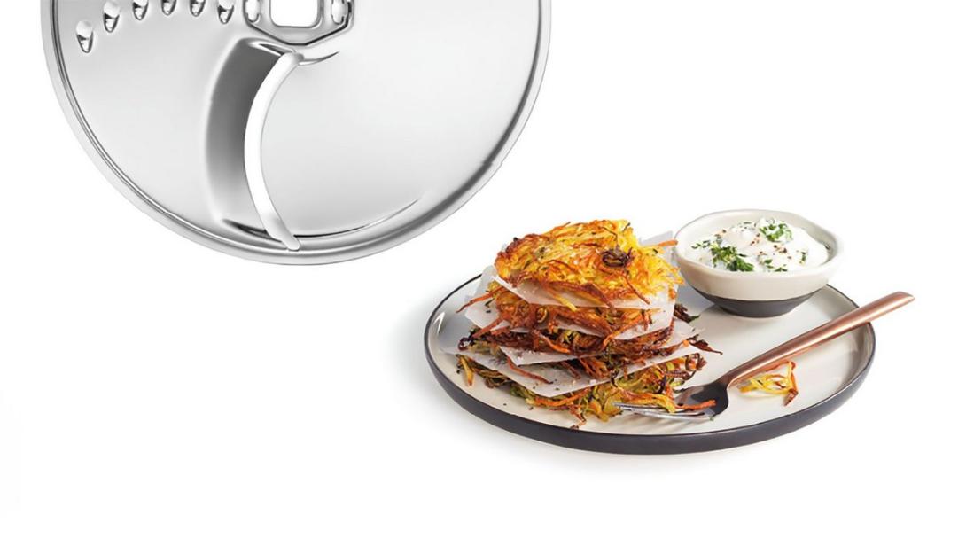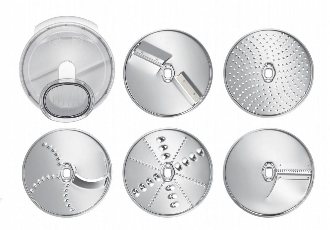 - Kotúče z nehrdzavejúcej ocele na sekanie, krájanie, strúhanie, vrátane krájača na prípravu zeleniny pre ázijskú kuchyňu a disk na krájanie zemiakov na prípravu vegetariánskych jedál.