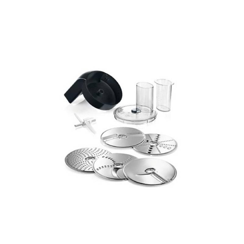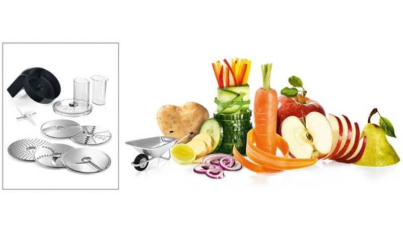 - otočný krájací kotúč (silné a tenké plátky), otočný strúhací kotúč (hrubý a jemný) a stredne jemný strúhací kotúč (= 5 funkcií)