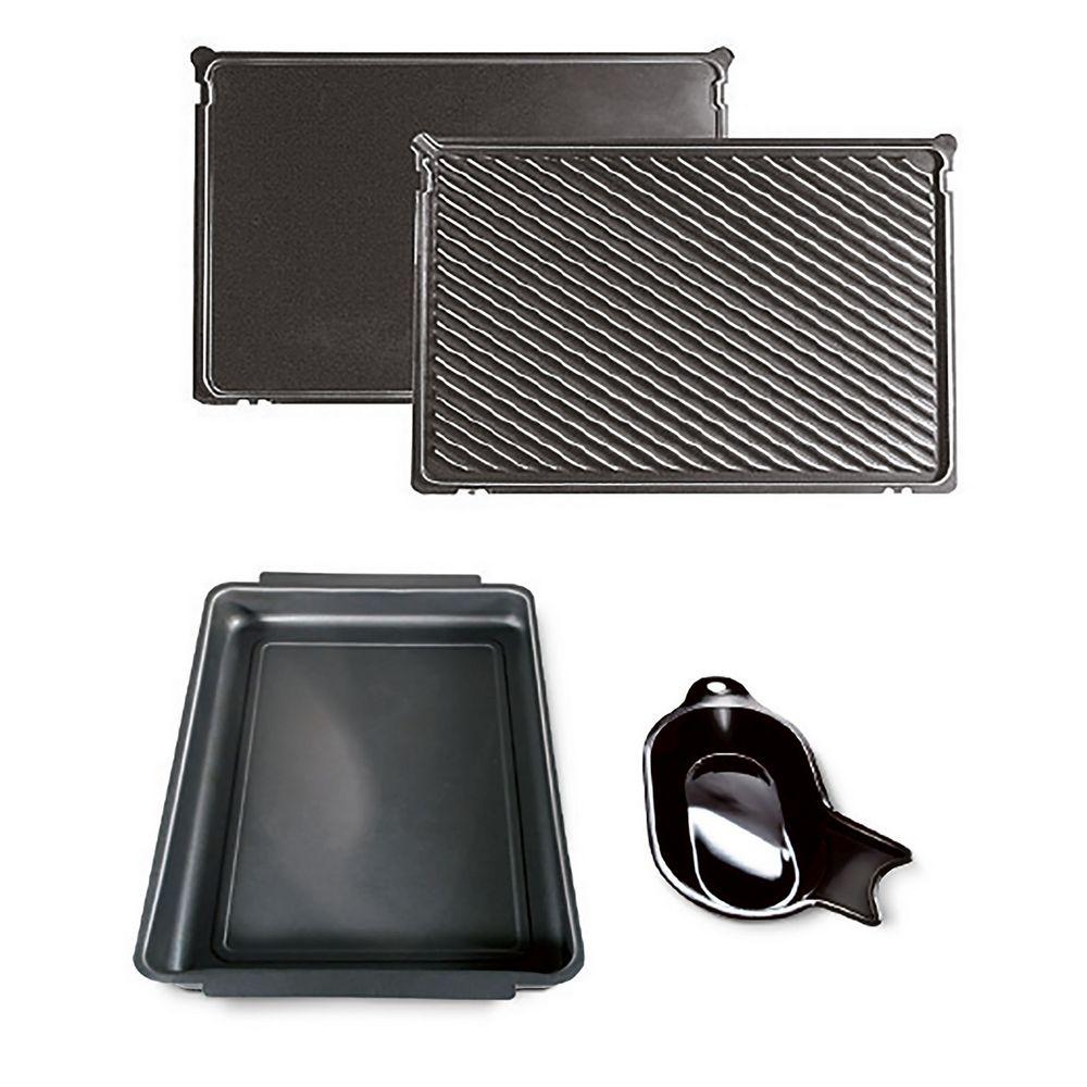 - Rozšírené funkcie: grilovacie platne s odvodným kanálikom pre tuk, dve odkvapkávacie misky a hliníkový pekáčik.