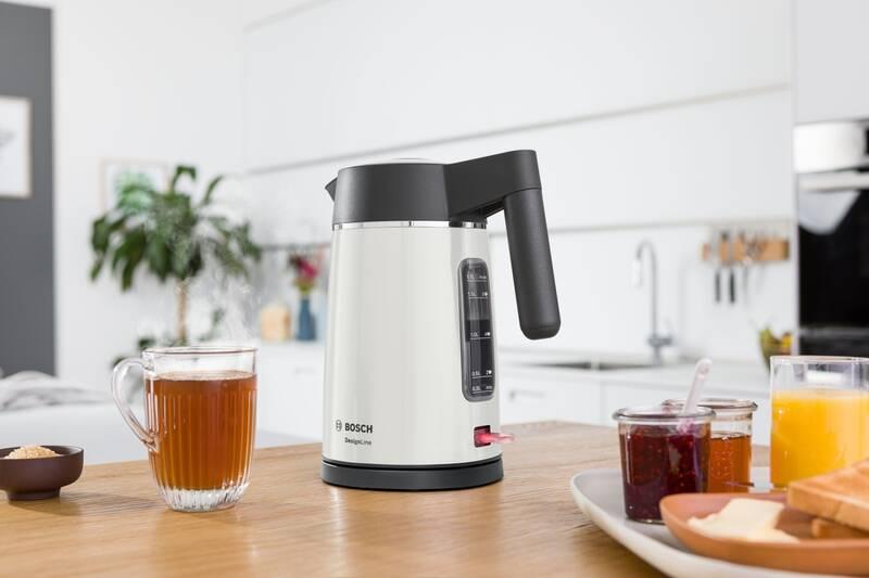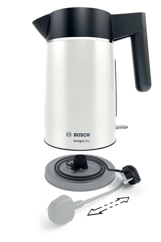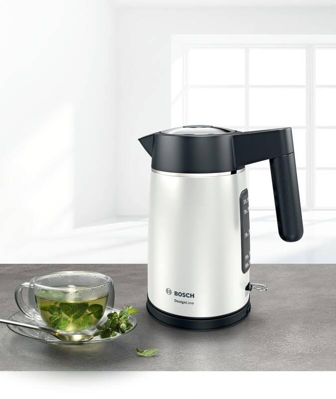 Rýchlovarná kanvica Bosch DesignLine TWK5P471 v elegantnom bielom vyhotovení je vhodný pomocník pre každodenné ohrievanie vody. Rýchly ohrev zaistí vysoký výkon 2 400 W, vďaka ktorému si môžete vychutnať svoj obľúbený nápoj počas krátkeho okamihu. Tento praktický pomocník s objemom 1,7 l, ktorý sa bude skvele vynímať na vašej kuchynskej linke, zvládne pripraviť vodu pre celú rodinu.