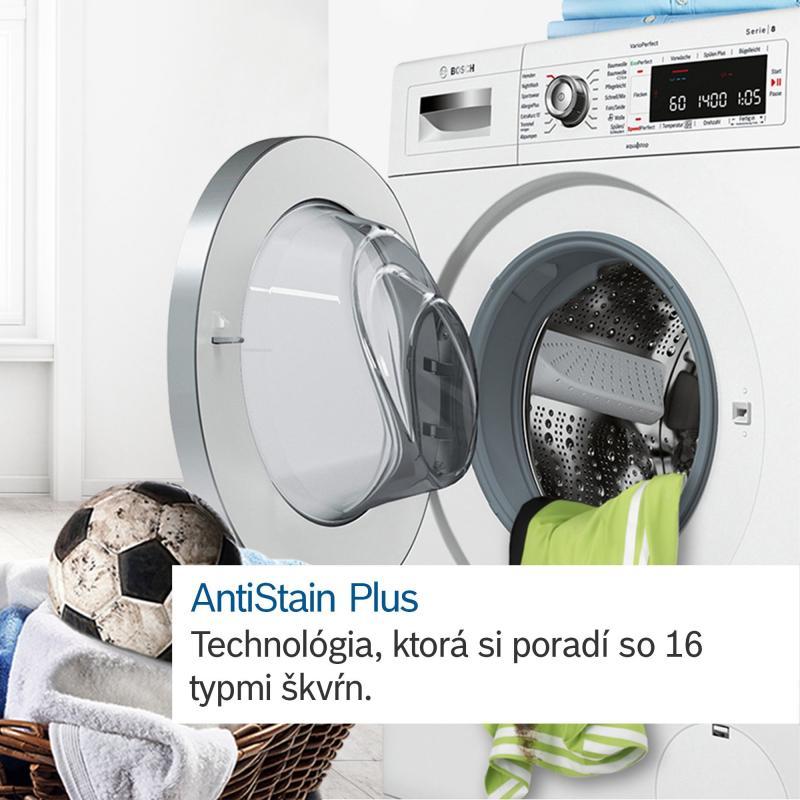 Škvrny na novom oblečení? Len žiadnu paniku. Zbavte svoje oblečenie škvŕn jednoducho a automaticky pomocou systému AntiStain Plus, ktorý si hravo poradí so 16 najodolnejšími škvrnami od čokolády cez trávu až po červené víno. Vaša práčka automaticky nastaví teplotu, pohyb bubna a čas namáčania tak, aby sa škvrny odstránili ľahko, automaticky a bez predošetrenia.