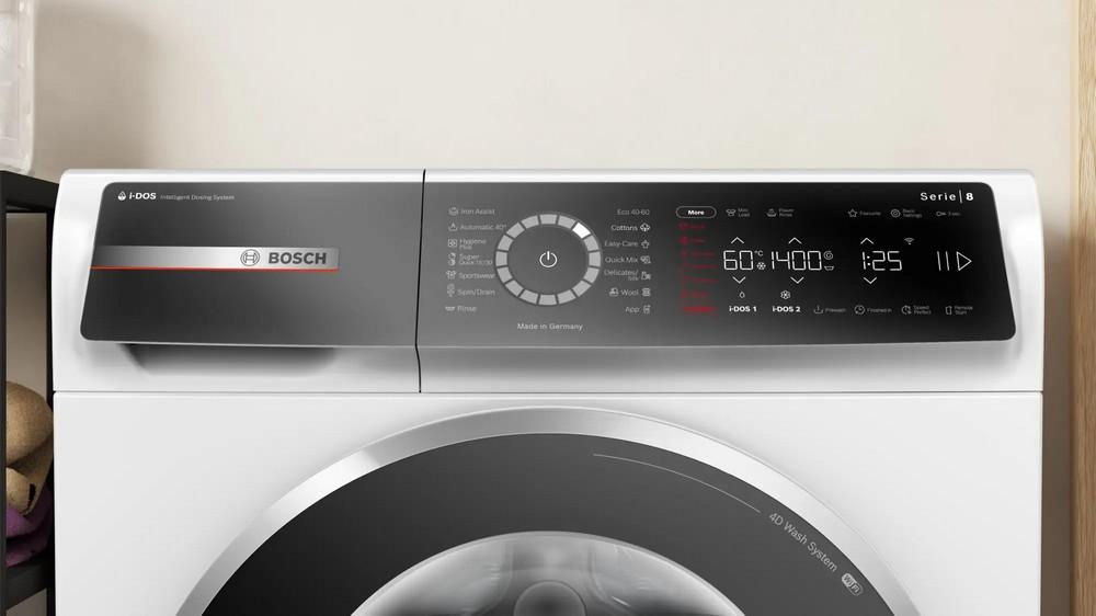 - TouchControl tlačidlá: základné nastavenie, zap./vyp., odloženie konca programu, voľba škvŕn, i-DOS 1, i-DOS 2, detská poistka, pamäť, viac možností, vzdialený štart, Mini Load – pranie jednotlivých kusov bielizne, štart/ pauza s reload funkciou (možnosť doplnenia bielizne), teplota, SpeedPerfect, predpierka, nastavenie počtu otáčok, silné plákanie/stop plákanie