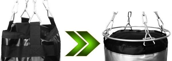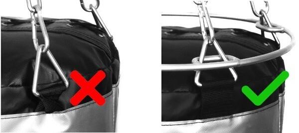 > Pri tréningu na vrecku sa nosné popruhy často prekrútia. Takéto prekrútenie vedie k nerovnomernému rozloženiu hmotnosti vrecka na popruhy, čo môže spôsobiť ich rýchlejšie opotrebovanie alebo roztrhnutie švov. Použitie obruče zabezpečuje prirodzené zarovnanie popruhov a zabraňuje ich krúteniu počas tréningu.