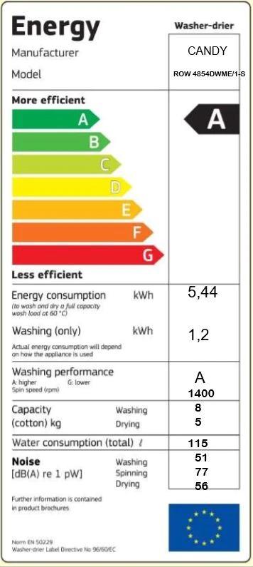 - Spotreba energie (pranie a sušenie plné prác náplň) (kWh): 5,44