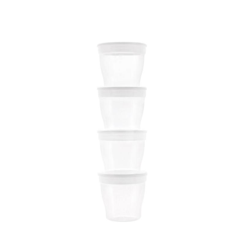 Praktické nádoby umožňujú dlhodobé skladovanie potravín pri zachovaní vysokej kvality. Majú pevné viečka, aby sa nič nevylialo ani pri naklonení nádoby. Môžete ich klásť na seba. Viečko môžete použiť aj ako stojan – na lepšiu stabilitu pri prenose tekutín. Majú zreteľnú stupnicu. Sú z materiálu určeného na styk s potravinami. Balenie obsahuje 4 kusy s viečkami. Objem 180 ml.