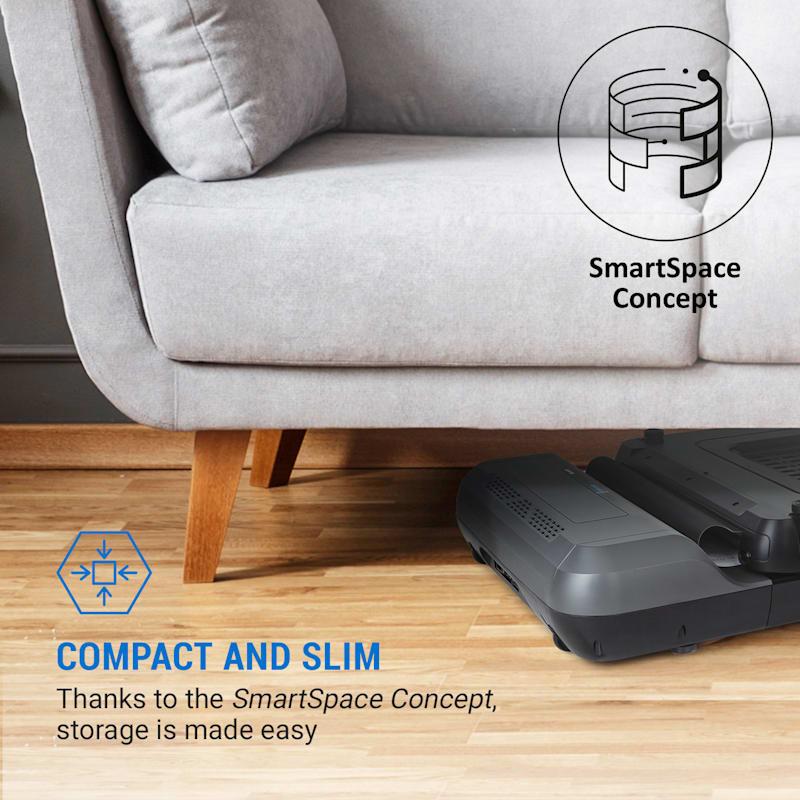 Ďalšou špeciálnou vlastnosťou bežeckého pásu Capital Sports Compact Space je koncepcia SmartSpace. Po tréningu sa dá bežecký pás veľmi jednoducho poskladať a priestorovo úsporne uskladniť. So svojím plochým dizajnom s výškou iba 16 cm a veľmi nízkou hmotnosťou len 50kg ho môžeš okrem toho ľahko prenášať. Užitočné sú pri tom dve transportné kolieska na prednej strane zariadenia. Praktický diaľkový ovládač tiež uľahčuje ovládanie bez otravného zostupovania zo zariadenia počas tréningu. Okrem toho si môžeš svoj tréning spestriť s aplikáciou Kinomap.