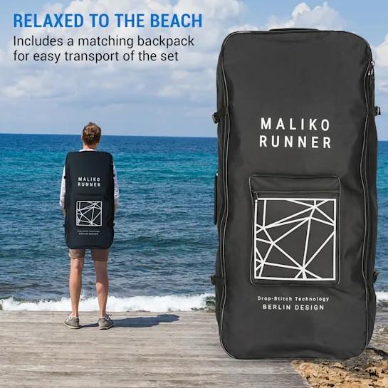 Všetko po ruke. SUP doska, teleskopické pádlo, bezpečnostné pútko na chodidlá, súprava na opravu a dvojzdvihová vzduchová pumpa – vo veľkom transportnom ruksaku sa nájde miesto na všetko. Všetky súčasti súpravy pritom spĺňajú tri kritériá: malý objem, nízka hmotnosť a vysoká stabilita.