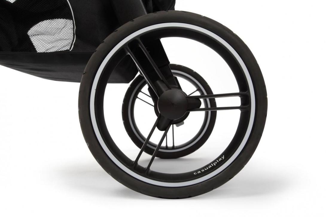 Predné kolesá menšie a zadné dostatočne veľké na to, aby sa vám do cesty nepriplietol žiadny kameň. vyrobené z PU-gumy sú odolnejšie ako z konvenčnej peny a môžu lepšie absorbovať nerovnosti terénu.