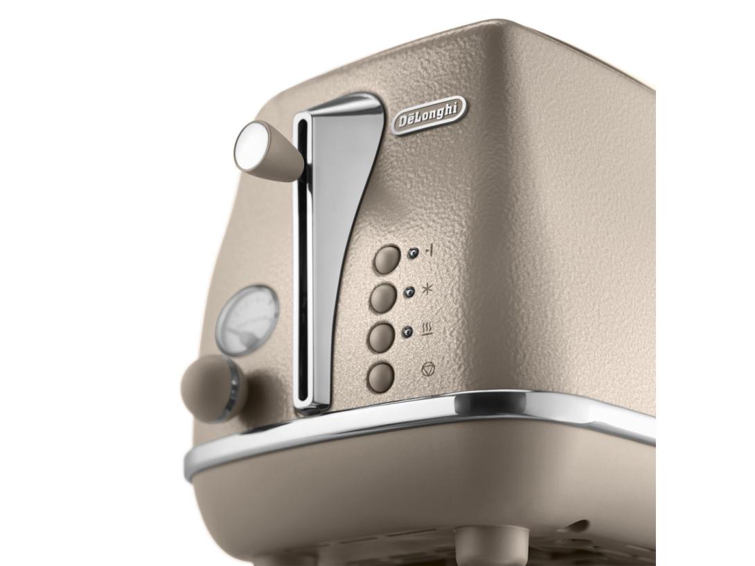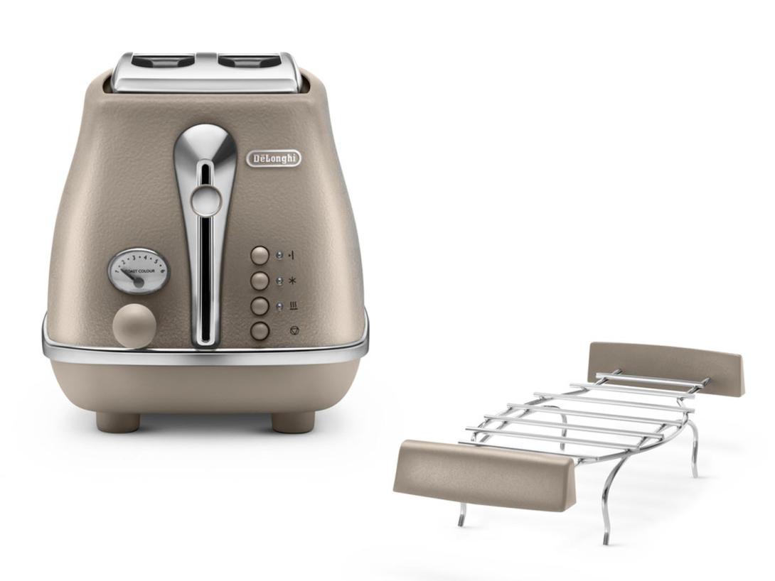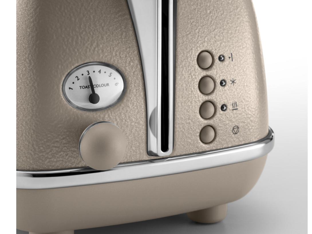 2- plátkový toaster z rady Icona Elements, Exkluzívna povrchová úprava s pochrómovanými detailami, Opekacia mriežka na rozpekanie pečiva, Elektronické ovládanie: ohrievanie, rozmrazovanie, opekanie a zrušenie; všetky