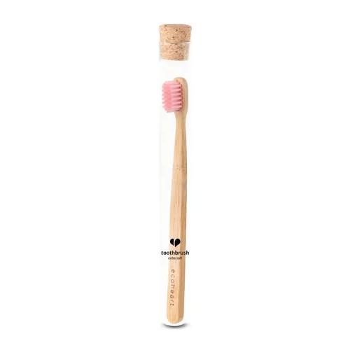 Ekologická zubná kefka z bukového dreva Ecoheart Extra Soft Pink je prínosom pre vaše zuby a ďasná a tiež pre planétu. Nylonové vlákna kefky sú jemné a šetrne odstraňujú nahromadený zubný povlak. Ecoheart Extra Soft Pink je balená v sklenenom obale s korkovým uzáverom.