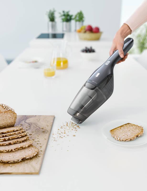 - Bezšňúrová sloboda: Omrvinky po raňajkách alebo štrk na chodbe? Úhľadne zaparkovaný vysávač Ergorapido na svojom nabíjacom podstavci je vždy pripravený na ďalšiu prácu. Žiaden kábel, žiadne problémy. Stačí len zobrať a ísť.