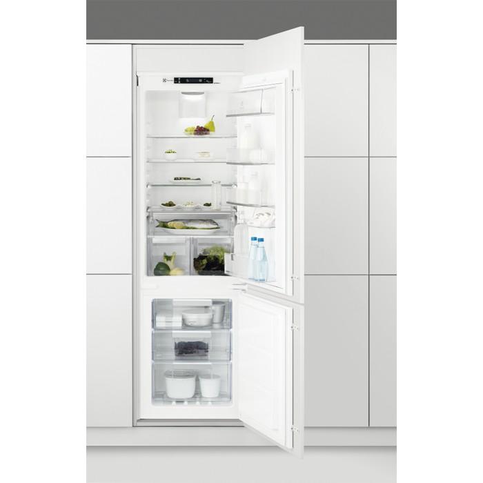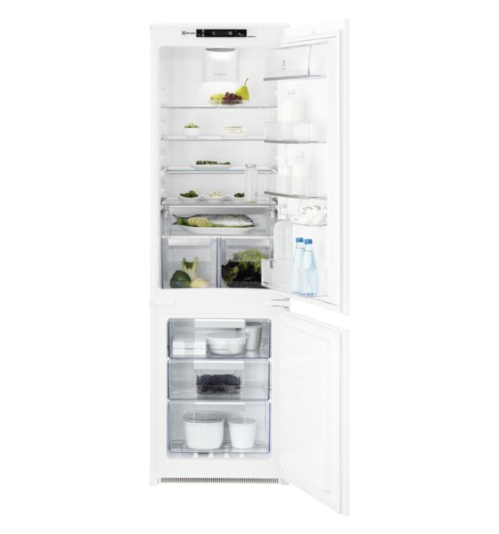 Electrolux ENN2854COW. Dizajn skrine: vstavaný, Farba: biela, Uchytenie dverí: Pravý. Celkový čistý objem: 263L, Celkový hrubý objem: 280L, Klimatická trieda: SN, ST, T, N. Čistá kapacita chladničky: 200L, Hrubá kapacita chladničky: 202L, Typ lampy: LED. Umiestnenie mrazničky: spodné, Čistá kapacita mrazničky: 63L, Hrubá kapacita mrazničky: 78L. Dĺžka kábla: 2,4 meter