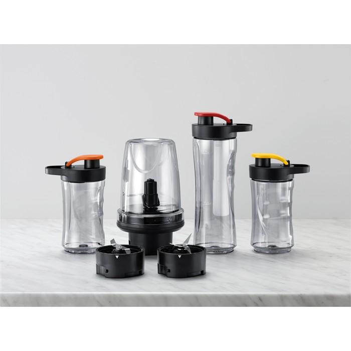 Objavte rozmanité možnosti vďaka všestrannému príslušenstvu: 600 ml fľaša s chladiacou vložkou a vekom s držiakom, dve 300 ml fľaše s viečkami a držiakom, sekacie zariadenie, príslušenstvo na mletie kávy.