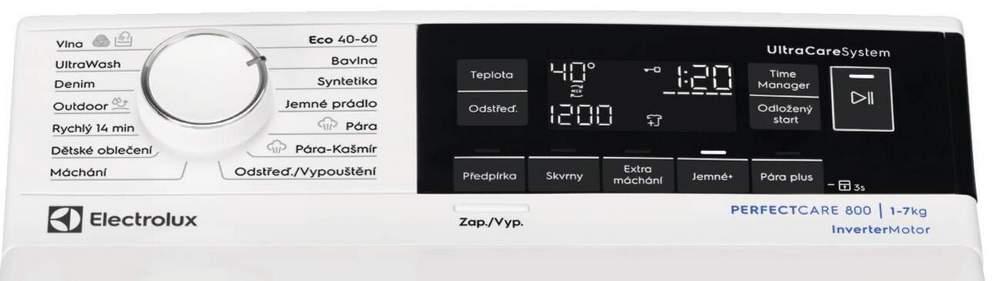 - Funkcie: Temp Selection, nastavenie rýchlosti odstreďovania, predpranie, Stain, extra plákanie, Soft Plus, Steam Plus, Delay, Time Manager, štart/pauza