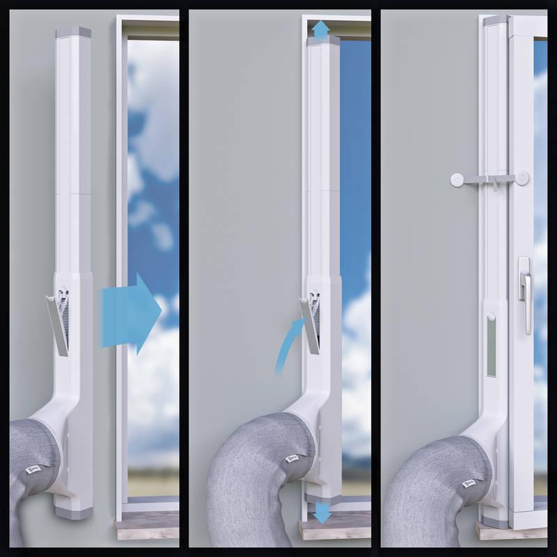 Predpripravená súprava na montáž na okno sa dá jednoducho nainštalovať za menej ako 30 sekúnd. Dopĺňa minimalistický dizajn prenosnej klimatizačnej jednotky a zabezpečuje nenápadný vývod vzduchu cez okno. Jednoducho zaistite na mieste pomocou blokovacieho mechanizmu a potom utesnite nastaviteľným pásom.