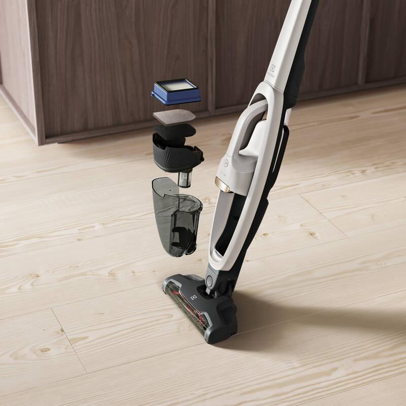 - Cyklónový filtračný systém: Silnejší ventilátor motora a o 50 % väčší, skladaný filter s dvojitou filtráciou, zlepšia výkon vášho vysávača Ergorapido.